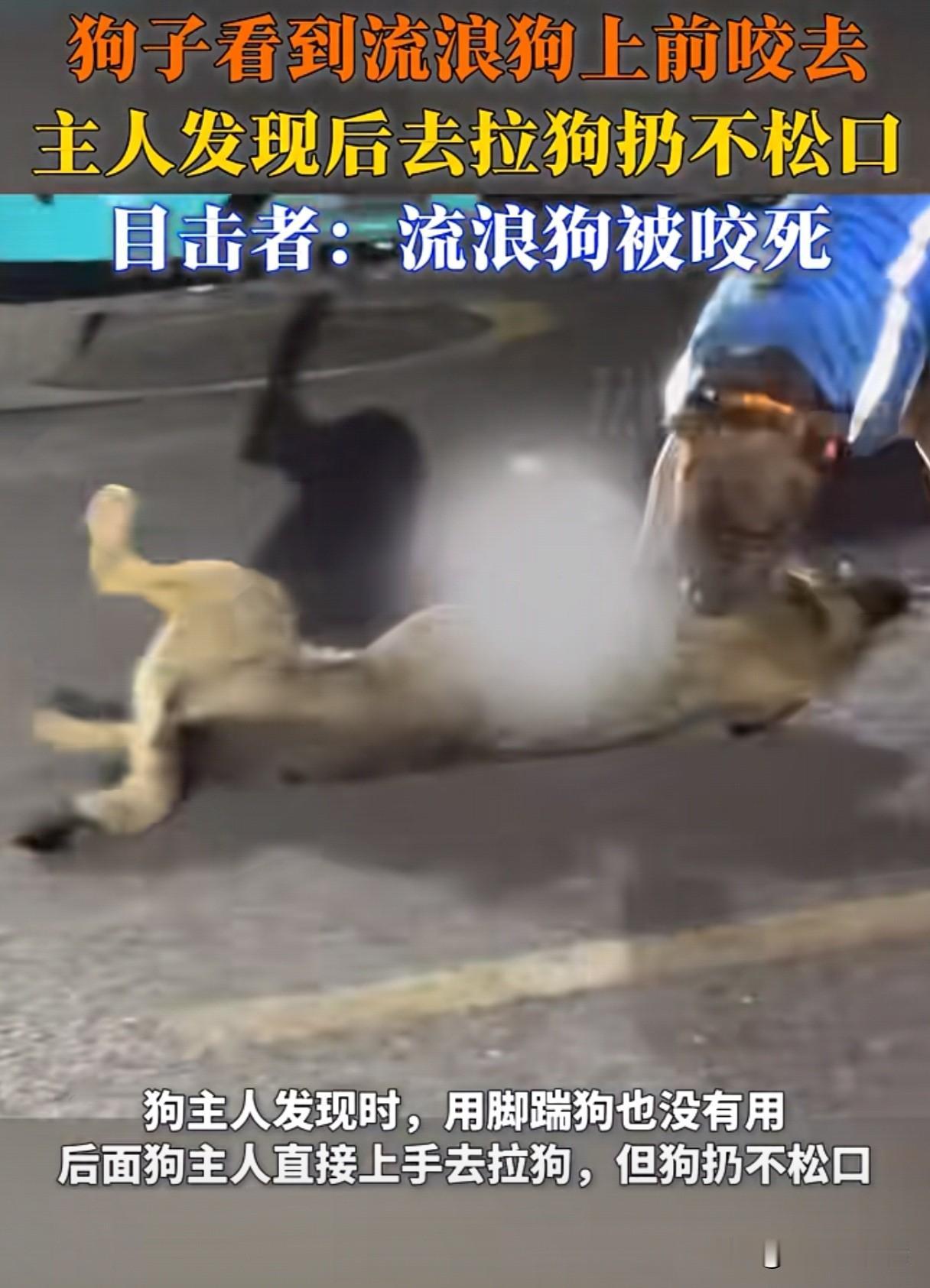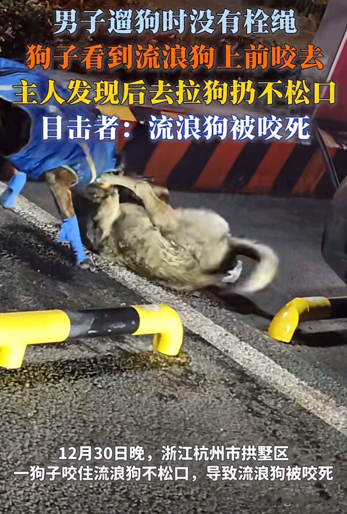 “心在滴血!可怜的流浪狗!” 12月30日晚,浙江杭州市拱墅区,一男子遛狗不拴绳,狗子咬住流浪狗不松口,目击者称:流浪狗现场被咬死! 烈性犬狗看到流浪狗上前就去咬,狗主人发现时,用脚踹狗也没有用,后面狗主人直接上手去拉狗,但狗仍不松口,直到可怜的流浪狗被活活咬死! 视频看得我们心碎了一地!网友评论:养过狗的人都知道,狗谁养,脾气就像谁,我也养狗,我支持处罚狗不拴绳男,让他知道问题的严重性。 网友的评论不是封建迷信,狗很有灵性,为了融入家庭,会模仿主人的行为习性!既然是烈性犬,为何这位狗主人出门不拴绳?不戴嘴罩? 流浪狗已经很可怜了,吃不饱没水喝没遮风避雨的地方,还被咬死了,这个痛苦的过程我们不敢去细思量!希望可怜的流浪狗去了汪星好过一点吧[流泪] 生命皆平等!带烈性犬出门为什么不栓绳子??? 这次是狗,下次可能是人,你照样会让局面失控!大家说说,这样的养狗人是不是应该重罚才解恨? 参考来源:蒙检传媒中心 遛狗不牵绳狗被咬死 流浪狗被咬死 遛狗不牵绳 流浪狗