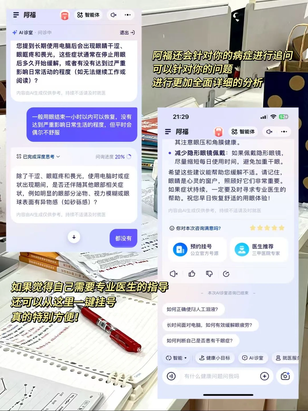 阿福可以为我们提供智能多轮对话。比如我问他关于我眼睛容易干涩疼痛的问题,它就会实时打通最新的医学文献帮助我解答我的眼睛不适问题。