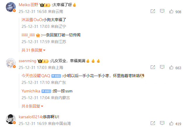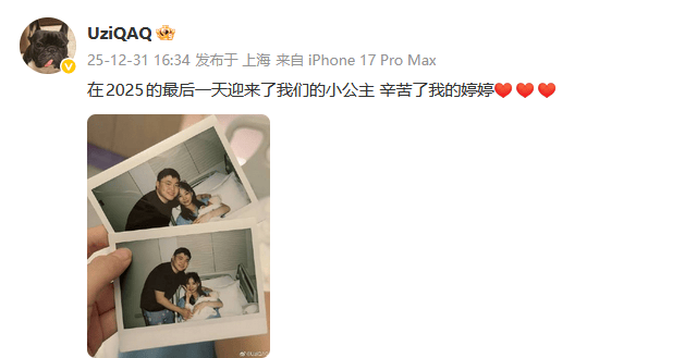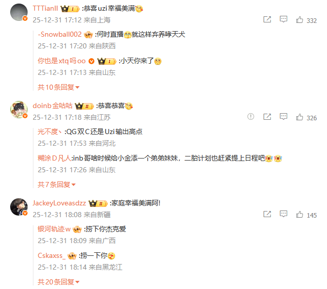 虎扑12月31日讯今日下午Uzi分享妻子生得一女儿喜讯,圈内众选手评论区祝福: