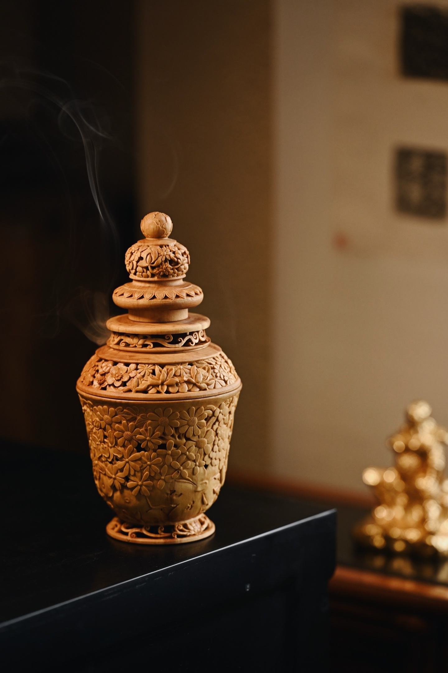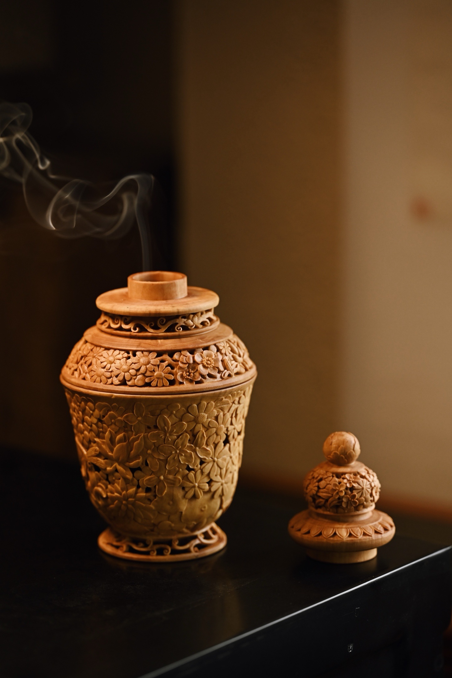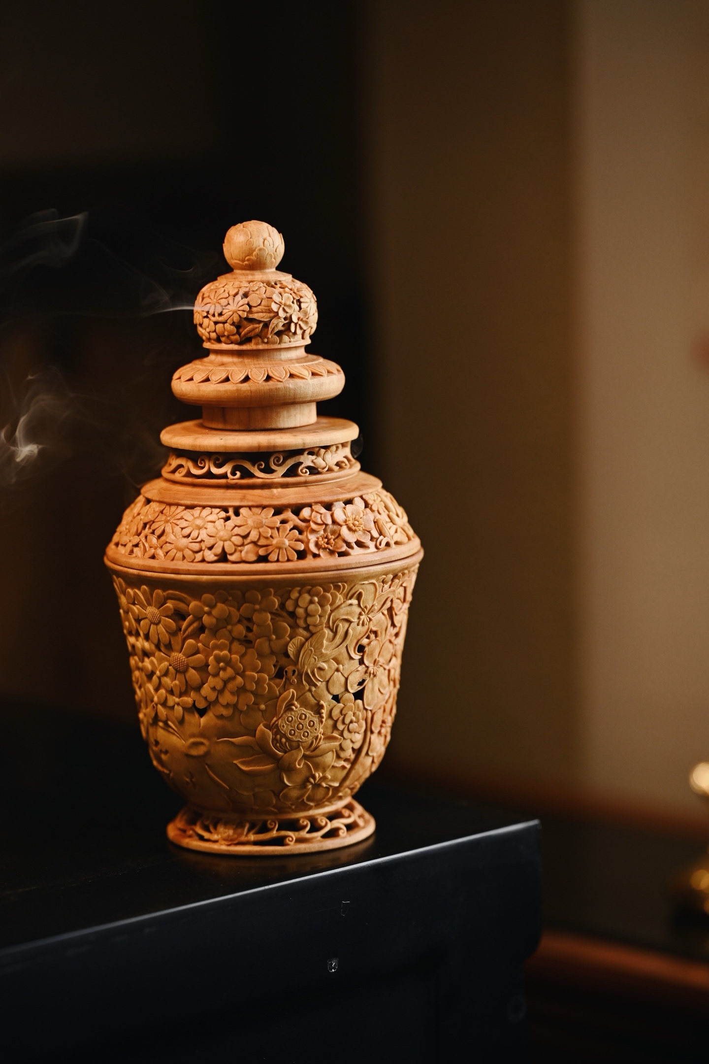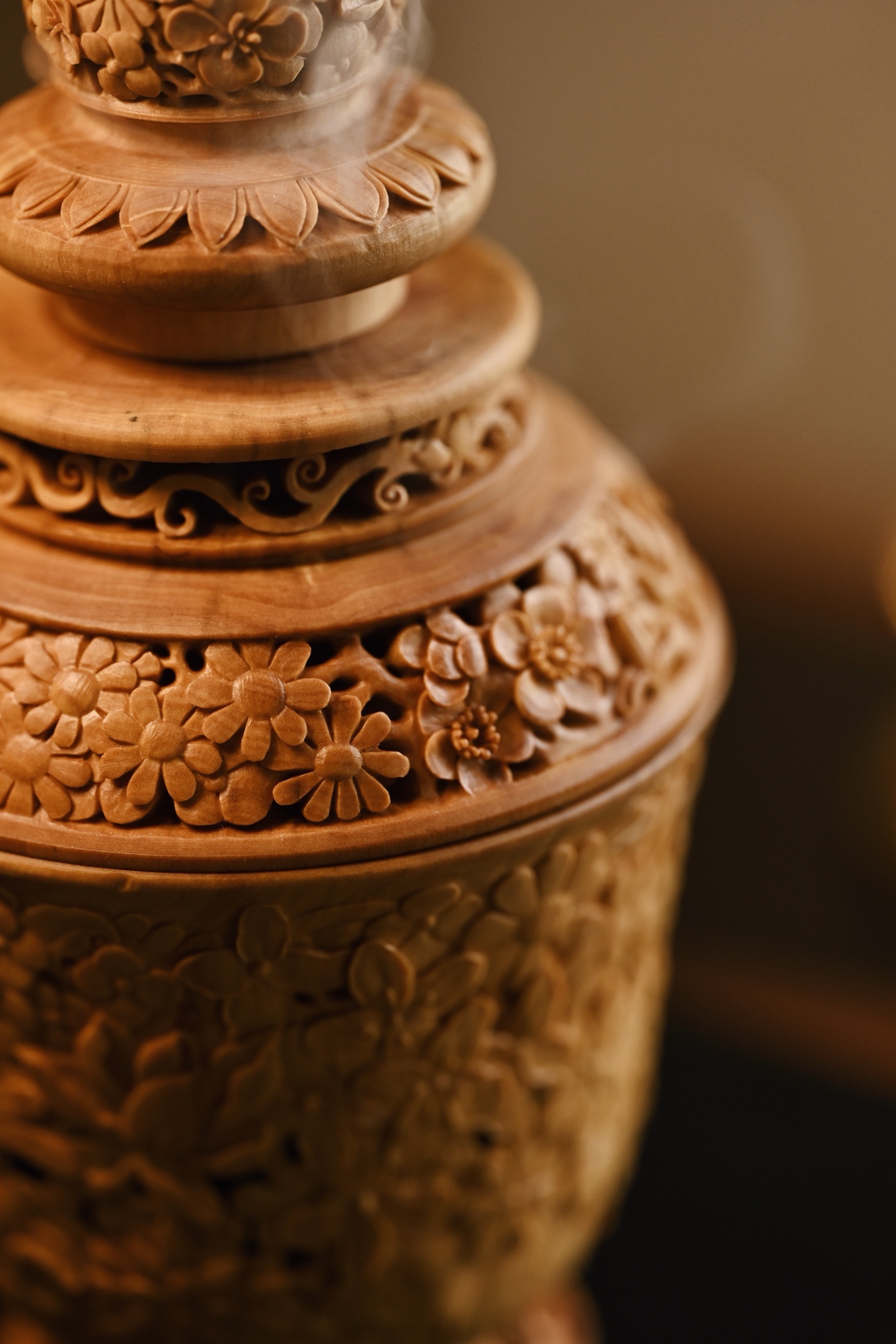 黄杨木 | 繁花 香炉三段式雕刻组合,料色清雅细腻,镂空雕刻各式花卉饱满流畅,布
