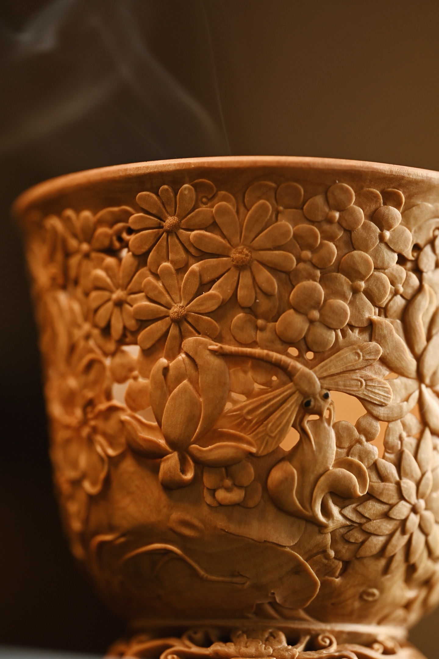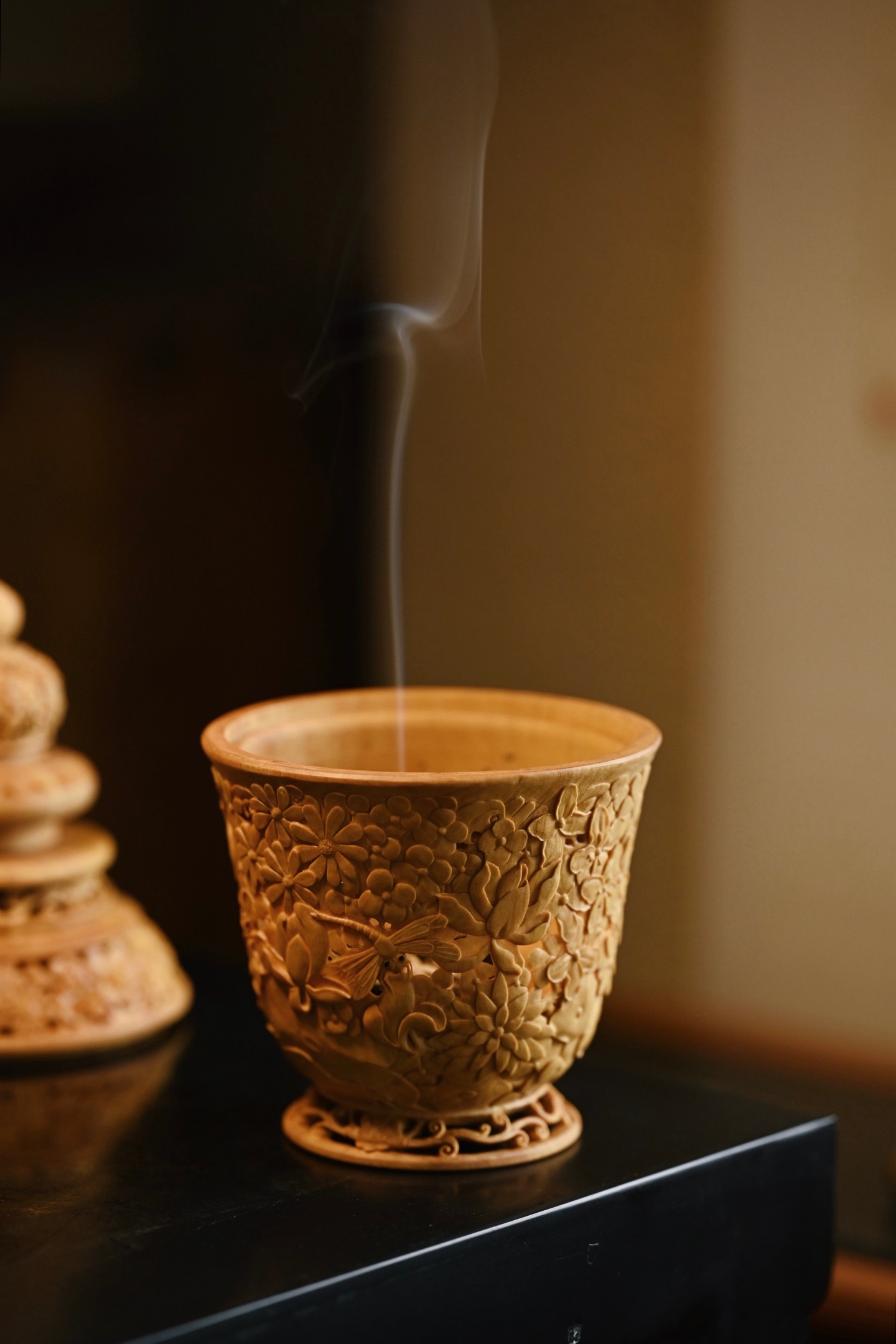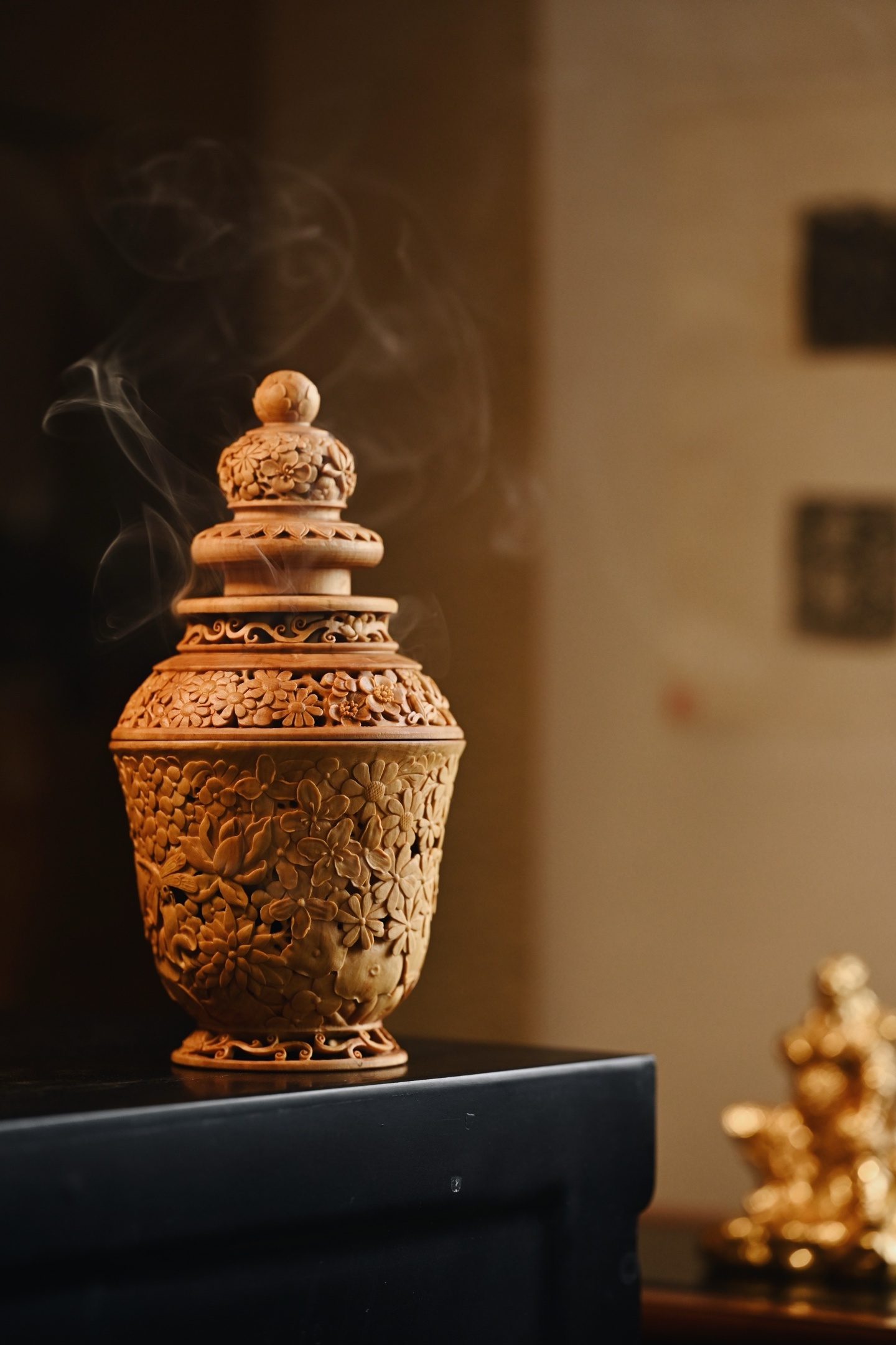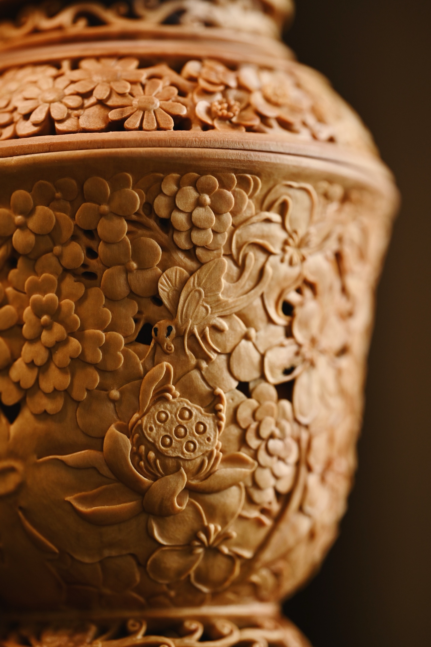 黄杨木 | 繁花 香炉三段式雕刻组合,料色清雅细腻,镂空雕刻各式花卉饱满流畅,布