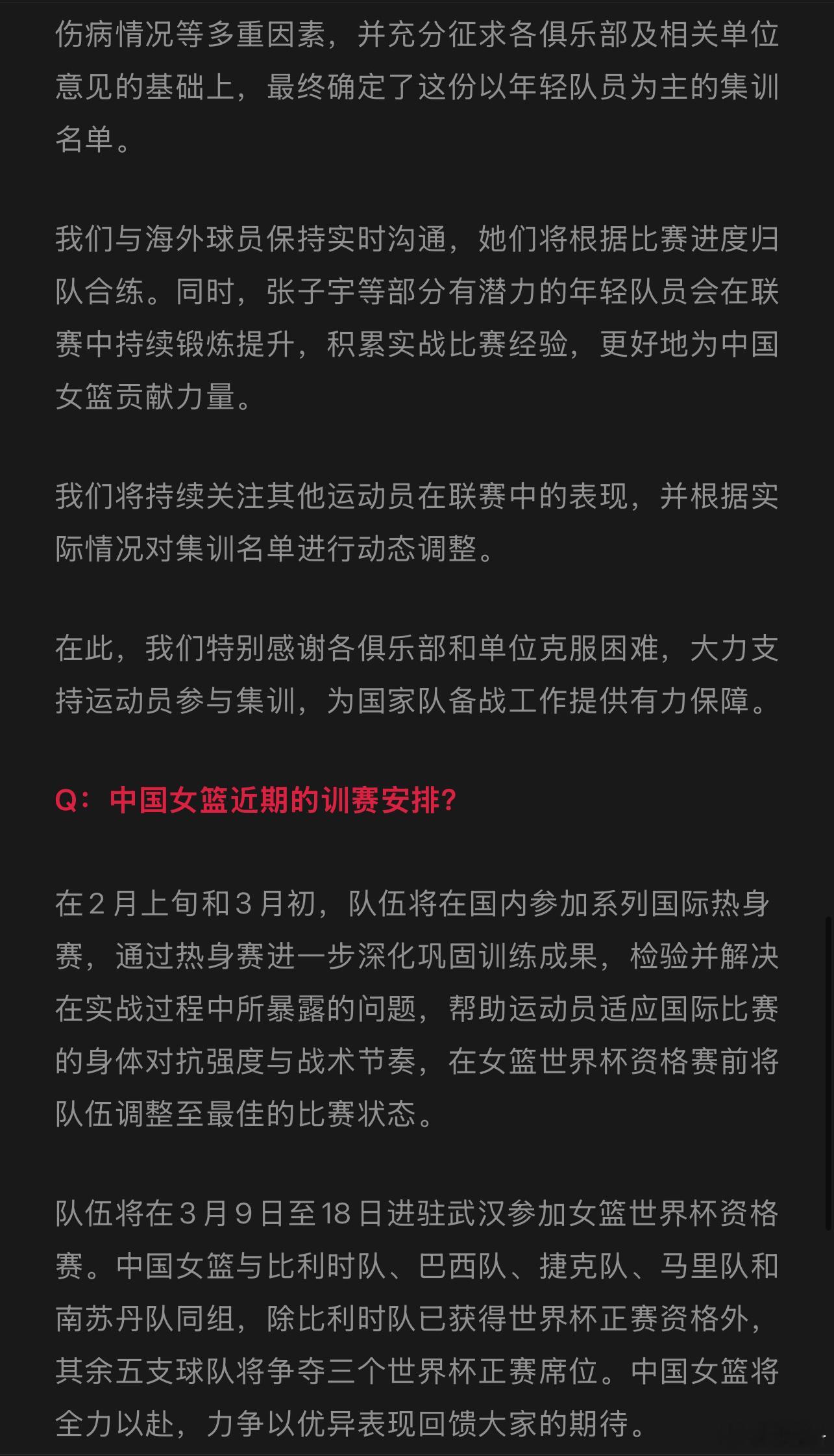 中国女篮 【国家女篮公布集训名单】为备战2026年国际篮联女篮世界杯资格赛,中国篮球协会将在WCBA第11轮比赛结束后,于1月4日组织国家女篮集训选拔工作。球队将与海外球员保持实时沟通,她们将根据比赛进度归队合练。同时,张子宇等部分有潜力的年轻队员会在联赛中持续锻炼提升,积累实战比赛经验,更好地为中国女篮贡献力量。中国女篮将在3月9日至18日进驻武汉参加女篮世界杯资格赛。中国女篮与比利时队、巴西队、捷克队、马里队和南苏丹队同组,除比利时队已获得世界杯正赛资格外,其余五支球队将争夺三个世界杯正赛席位。中国女篮将全力以赴,力争以优异表现回馈大家的期待。