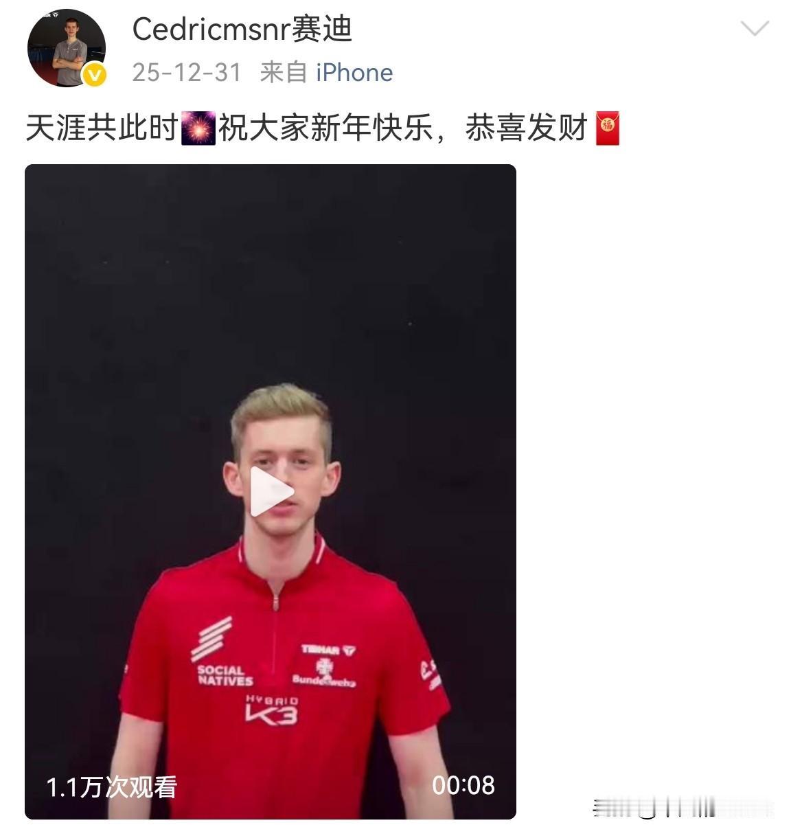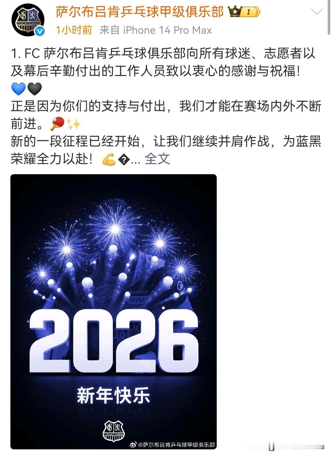 2026年1月1日,德甲萨尔布吕肯俱乐部更新动态,并向所有球迷、志愿者、以及幕后的工作人员致以衷心的感谢与祝福。 俱乐部发了一张新年贺图,图上有数字2026、中文“新年快乐”以及俱乐部的logo。 从新年贺图可以看出,萨尔布吕肯俱乐部还是挺用心的,在凌晨2点13分发文祝国内球迷新年快乐。 自从樊振东官宣加盟萨尔布吕肯俱乐部后,直接掀起了一股看球热潮,门票秒罄,场馆的位置都不够坐,主办方不得不增加临时看台。 去年,樊振东在德国出战12场,战绩9胜3负。 他在国外打球的同时,还夺得了十五届全运会乒乓球项目男子单打冠军,依旧保持“T0级选手”水准。 东东没有出现在乒超联赛总决赛的舞台上,他在德甲的下一场比赛时间是1月4日,喜欢的朋友可以关注一下。 我发现东东的德甲队友赛后迪专门录了个视频,用中文祝大家“新年快乐,恭喜发财”。 我发现他的中文还有点好也,网友都称他为德国版“周恺”,不是谁都能坐上东东的副驾,哈哈哈。 新的一年开始了,祝樊振东、周恺和赵子豪生活工作一切顺利,也祝网友们天天开心,心想事成。