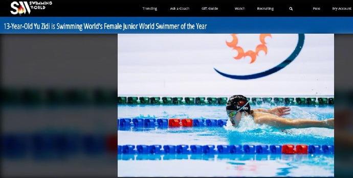 中国13岁小将于子迪当选。至此,她已包揽知名游泳媒体SwimSwam与《世界游泳》两大权威媒体的年度最佳青年运动员荣誉。