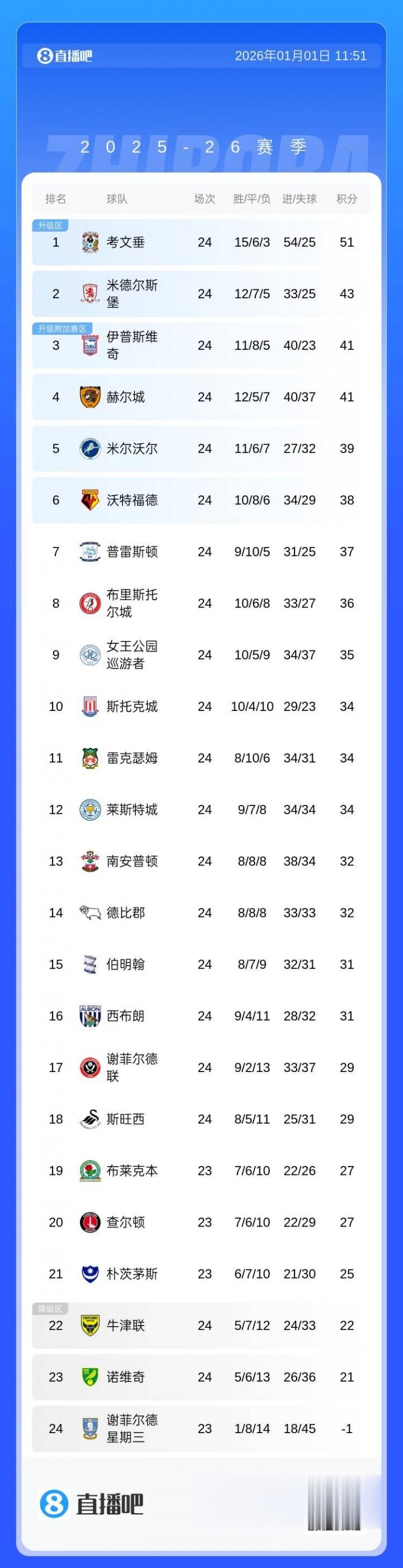 但在英冠,还有一支队伍比他更惨。谢菲尔德星期三因为财务问题,积分被扣除12分。英冠23轮战罢之后,他们1胜8平14负,还没把积分踢成正数,目前是-1分断层垫底英冠。