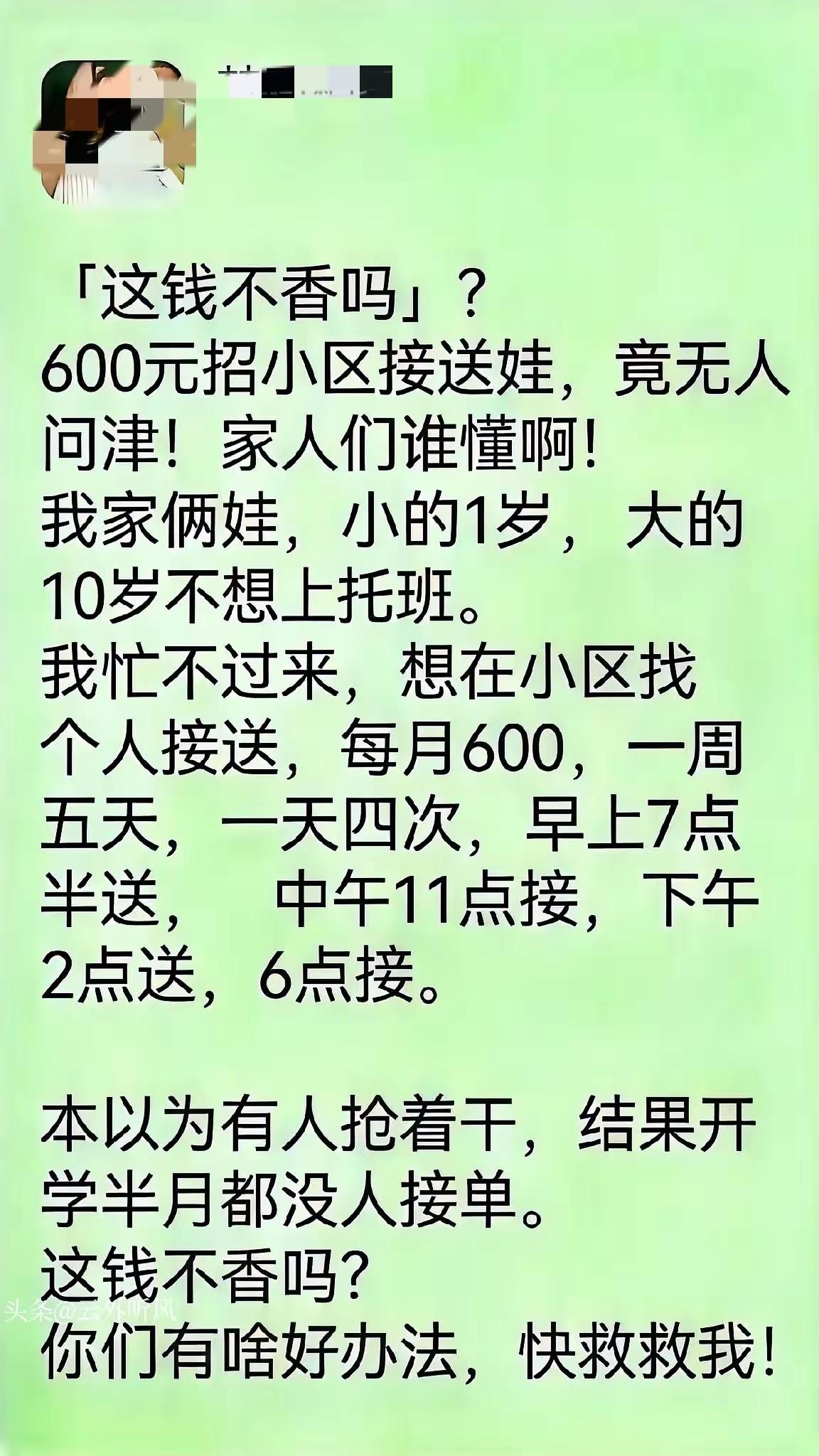 你给的太多了,没人敢接单,以为你是骗子,应该是觉得钱来得太容易,害怕被骗,降低点就好了。一天固定时间接送四次,时间完全被接送这个事控制了,有急事也干不了。按照每天四次,一个月至少接22天,也就是88次,每次接送按照半个小时到一个小时计算,每次接送不到七块钱,有这个时间,感觉不如去跑外卖,比这赚的多。