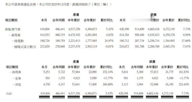 比亚迪2025年12月新能源汽车产量41.98万辆,销量42.04万辆。全年累计产量453.74万辆,同比增长5.42%;累计销量460.24万辆,同比增长7.73%,与年度目标持平。数据显示,2025年比亚迪海外年销量首次突破100万辆,同比增长145%。