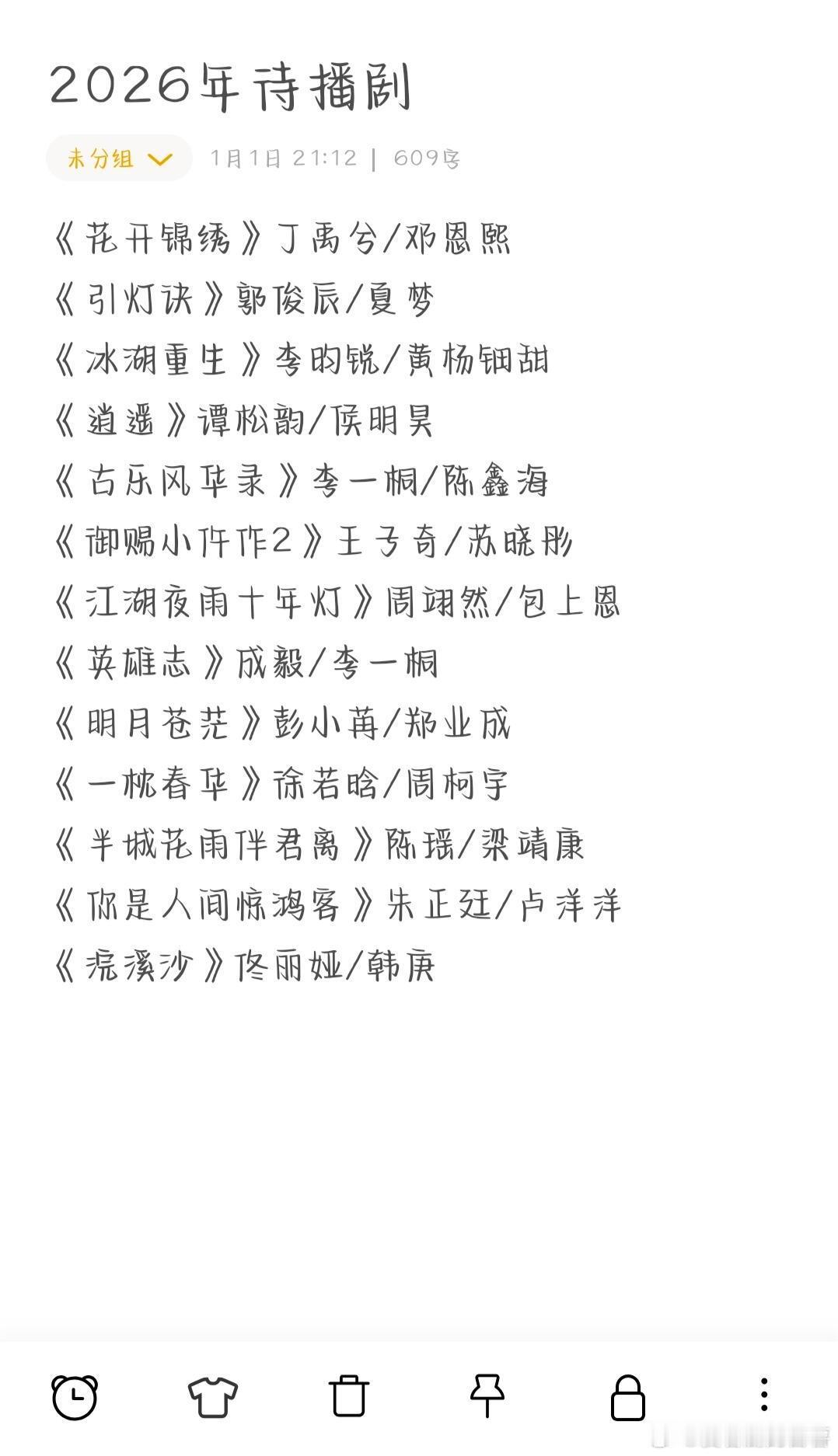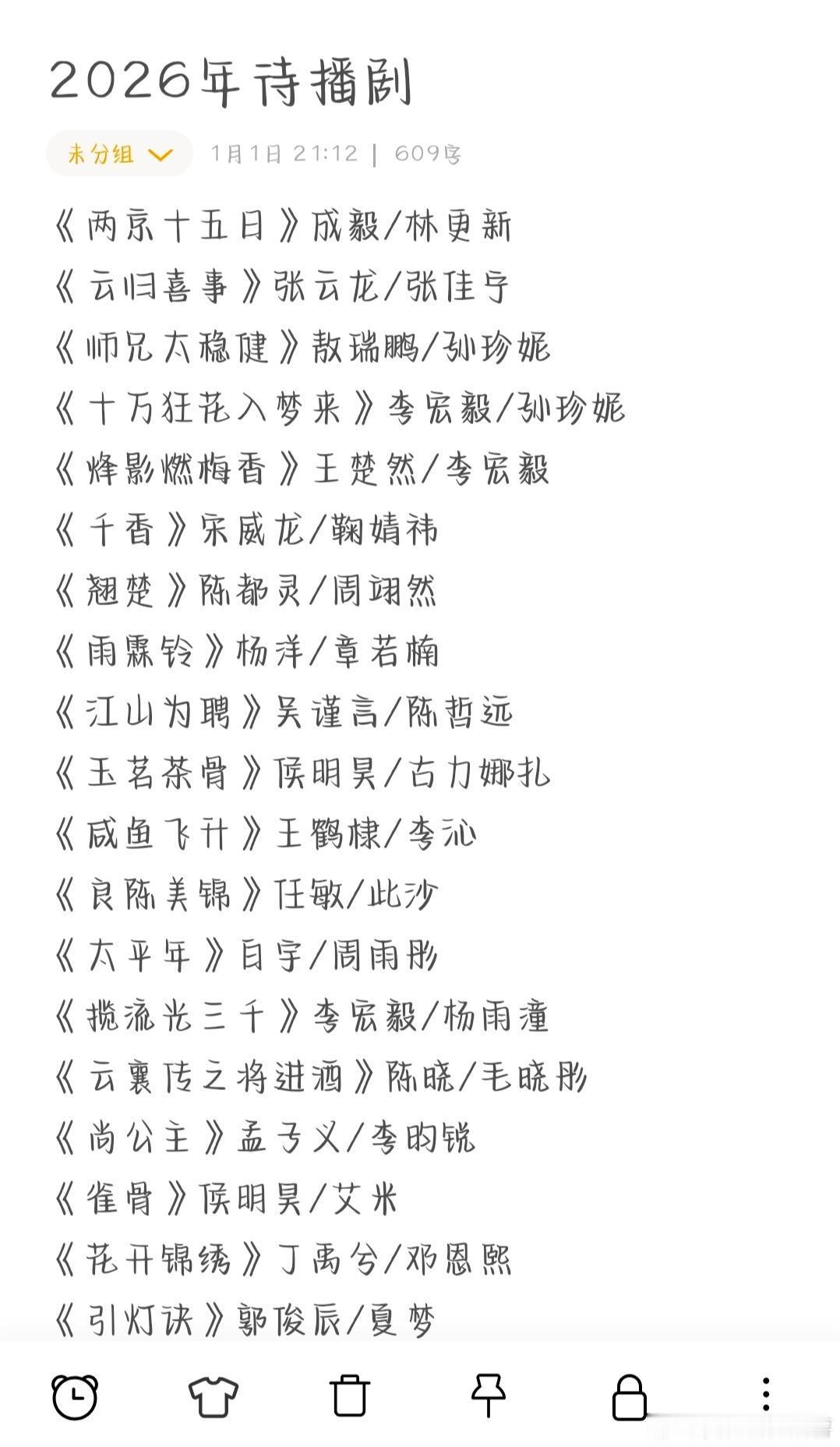 2026年待播剧❗️❗️《成何体统》丞磊/王楚然《逐玉》张凌赫/田曦薇《云秀行》李一桐/曾舜晞《来战》鞠婧祎/张云龙《九门2》陈伟霆/曾舜晞《月鳞绮纪》鞠婧祎/田嘉瑞《唐宫奇案之青雾风鸣》白鹿/王星越《家业》杨紫/韩东君《梦花廷》陈哲远/张婧仪《慕胥辞》迪丽热巴/陈飞宇《百花杀》孟子义/何与《表妹万福》宋祖儿/陈鑫海《兰香如故》谭松韵/刘学义《莫离》白鹿/丞磊《红尘四合》王星越/徐若晗《一点浩然气》敖瑞鹏/代露娃《佳偶天成》任嘉伦/王鹤润《明月千里》包上恩/王弘毅《两京十五日》成毅/林更新《云归喜事》张云龙/张佳宁《师兄太稳健》敖瑞鹏/孙珍妮《十万狂花入梦来》李宏毅/孙珍妮《烽影燃梅香》王楚然/李宏毅《千香》宋威龙/鞠婧祎《翘楚》陈都灵/周翊然《雨霖铃》杨洋/章若楠《江山为聘》吴谨言/陈哲远《玉茗茶骨》侯明昊/古力娜扎《咸鱼飞升》王鹤棣/李沁《良陈美锦》任敏/此沙《太平年》白宇/周雨彤《揽流光三千》李宏毅/杨雨潼《云襄传之将进酒》陈晓/毛晓彤《尚公主》孟子义/李昀锐《雀骨》侯明昊/艾米《花开锦绣》丁禹兮/邓恩熙《引灯诀》郭俊辰/夏梦《冰湖重生》李昀锐/黄杨钿甜《逍遥》谭松韵/侯明昊《古乐风华录》李一桐/陈鑫海《御赐小仵作2》王子奇/苏晓彤《江湖夜雨十年灯》周翊然/包上恩《英雄志》成毅/李一桐《明月苍茫》彭小苒/郑业成《一枕春华》徐若晗/周柯宇《半城花雨伴君离》陈瑶/梁靖康《你是人间惊鸿客》朱正廷/卢洋洋《浣溪沙》佟丽娅/韩庚