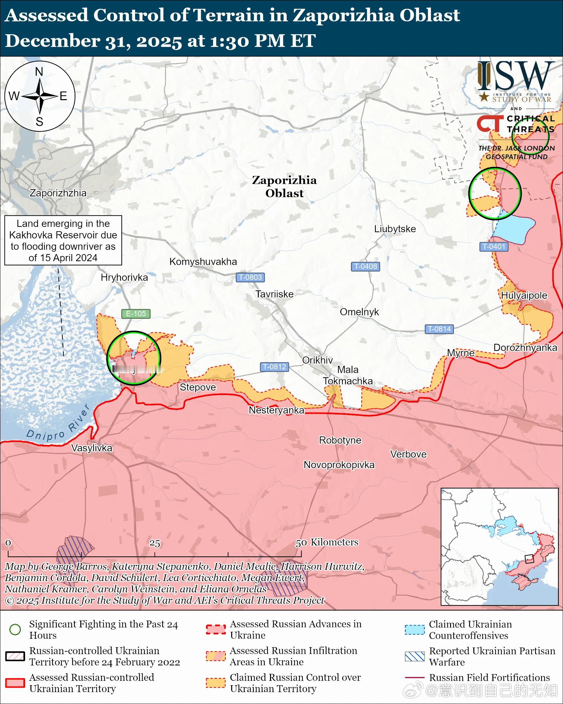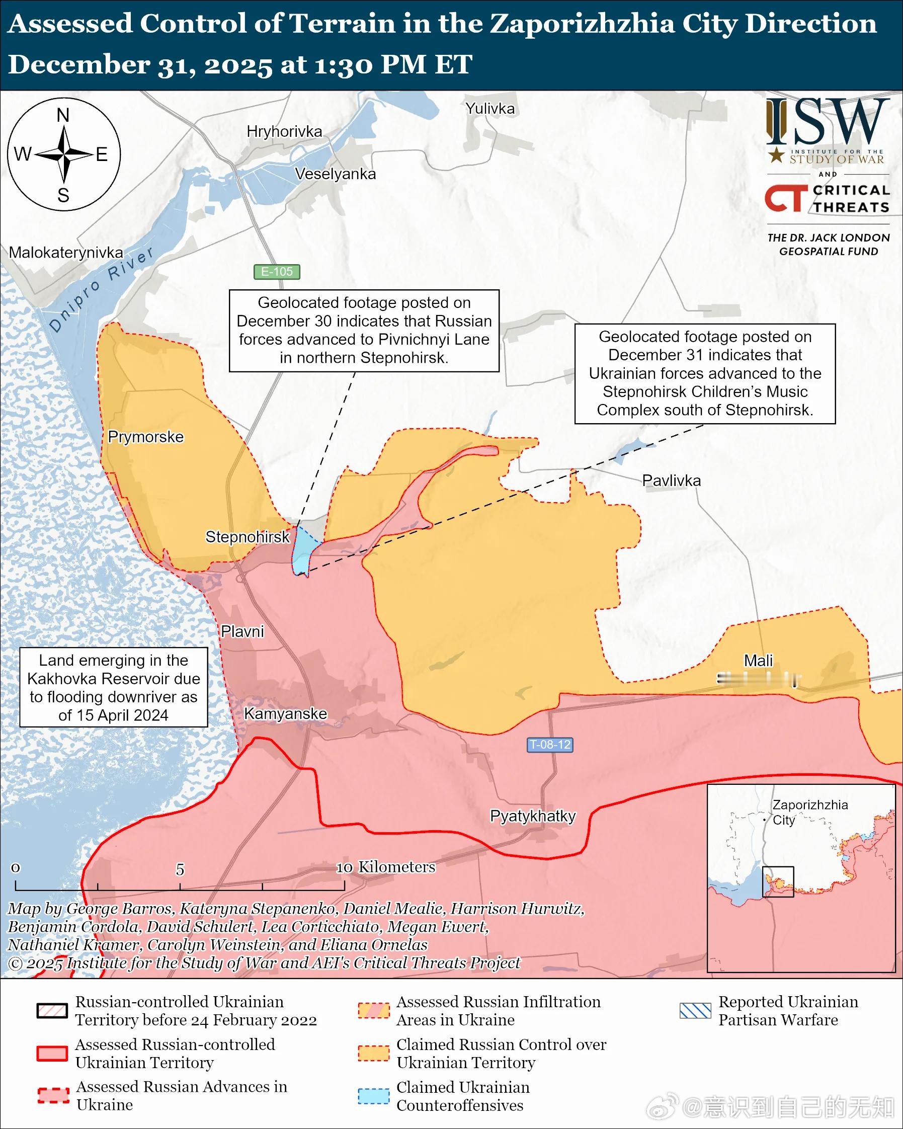 南方轴心俄军目标:守住前线阵地,确保后方免受乌克兰军队袭击,并推进至扎波罗热市的火炮射程之内。12月31日俄军继续向胡利亚波列方向发起进攻,但并未取得确切进展。未经证实的说法:一位俄罗斯军事博主声称,俄军已推进到瓦尔瓦里夫卡(胡利亚伊波列以北)的西部郊区。12月30日和31日俄军在胡利亚伊波列附近发动进攻;胡利亚伊波列西北方向的捷尔努瓦特;胡利亚伊波列北部的丹尼利夫卡、瓦尔瓦里夫卡和多布罗皮利亚附近;胡利亚伊波列东北方向的索洛德克、雷布内、普里维利亚和兹拉霍达附近;胡利亚伊波列南部的多罗日尼扬卡附近;以及胡利亚伊波列西部的扎利兹尼奇涅和斯塔鲁乌克莱因卡方向。一位俄罗斯军事博客作者声称,乌克兰军队在胡利亚伊波列附近进行了反击。12月31日乌克兰南方作战司令部驳斥了俄方关于俄军完全控制胡利亚伊波列的说法。作战序列:俄第60独立摩托化步兵旅、第1无人系统营、第305炮兵旅(均隶属于第5合成集团军[CAA],东部军区[EMD])以及第14特种部队旅(隶属于俄罗斯总参谋部情报总局[GRU])正在希尔克东部(胡利亚伊波列以西)打击乌克兰军队。第11集团军(隶属于俄罗斯空天军[VKS]和东部军区[EMD])正在里兹德维扬卡(胡利亚伊波列西北部)对乌克兰军队进行FAB无制导滑翔炸弹袭击。第189摩步团(隶属于第35合成集团军[CAA],东部军区[EMD])正在扎波罗热方向作战。乌克兰军队最近在扎波罗热州西部取得了进展。评估乌克兰的进展:12 月 30 日发布的地理定位视频显示,乌克兰军队在斯捷普诺戈尔斯克(奥里希夫以西)取得了进展。评估俄军的进展:12 月 30 日发布的地理定位视频显示,俄军此前已在斯捷普诺戈尔斯克取得进展。ISW 评估认为,这一变化并非发生在过去 24 小时内。俄罗斯声称占领的区域范围:12 月 30 日发布的地理定位视频显示,乌克兰军队在斯捷普诺戈尔斯克以北保持着阵地或最近取得了进展,而俄方此前声称俄军在该地区驻扎。未经证实的说法:一位俄罗斯军事博主声称,俄军向卢基尼奥夫斯克(奥里希夫西北部)北部和西北部推进,并进入普里莫尔斯克(奥里希夫西部)。12月30日和31日,俄军从奥里希夫东南方向的比洛希里亚附近以及奥里希夫西方向的普里莫尔斯克附近,向帕夫利夫卡和诺沃亚科夫利夫卡方向发动进攻。作战序列:据报道俄第247空降团(第7空降师)正在斯捷普诺戈尔斯克作战。第4军事基地(第58集团军,南部军区)的拦截无人机操作员正在奥里希夫附近打击乌克兰无人机。第108空降团和第162独立侦察营(均隶属于第7空降师)的无人机操作员正在扎波罗热方向作战。第 291 摩步团(第 42 摩步师,第 58 集团军,SMD)第 3 突击连的“涅梅茨”小组和第 70 摩步团(第 42 摩步师)正在扎波罗热方向活动。巴尔萨斯-萨尔马特无人系统特种用途中心(原巴尔萨斯-萨尔马特支队,隶属于空降兵部队)的无人机操作员正在扎波罗热州活动。12月30日和31日,俄军在第聂伯罗方向进行了有限的地面进攻,包括从赫尔松市向东朝安东尼夫斯基桥方向进攻,但没有取得进展。