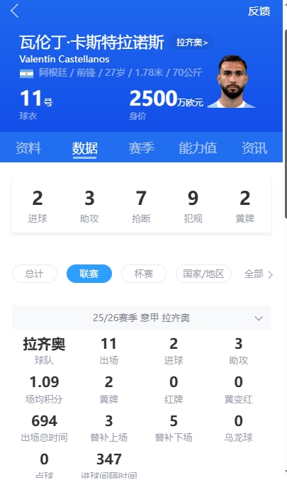 卡斯特拉诺本赛季为拉齐奥在意甲出战了11场,有2球3助,现在转会市场为他的估值为2500万欧元。