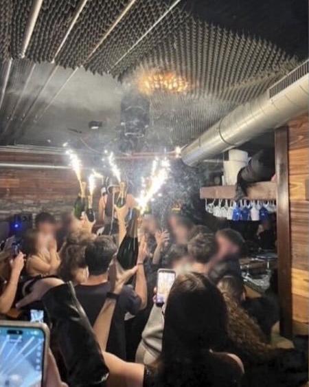 据说这就是瑞士酒吧纵火的凶手,戴面具的男子肩顶女子,女子一手拿着烟花,一手拿着香槟。酒吧层高矮,烟花点燃了天花板下的隔音棉,易燃的隔音棉快速燃烧,一下子就让酒吧天花板爆燃,形成火瀑,人群恐慌,灯光昏暗找不到出口,导致人员拥挤踩踏。很多人不是被烧死,而是被有毒的烟雾毒死的。40人死亡,115人受伤,这真是新年第一次惨剧。