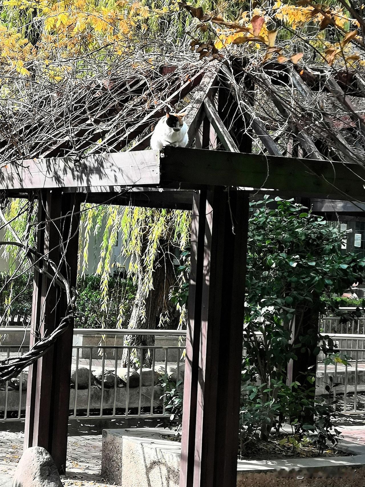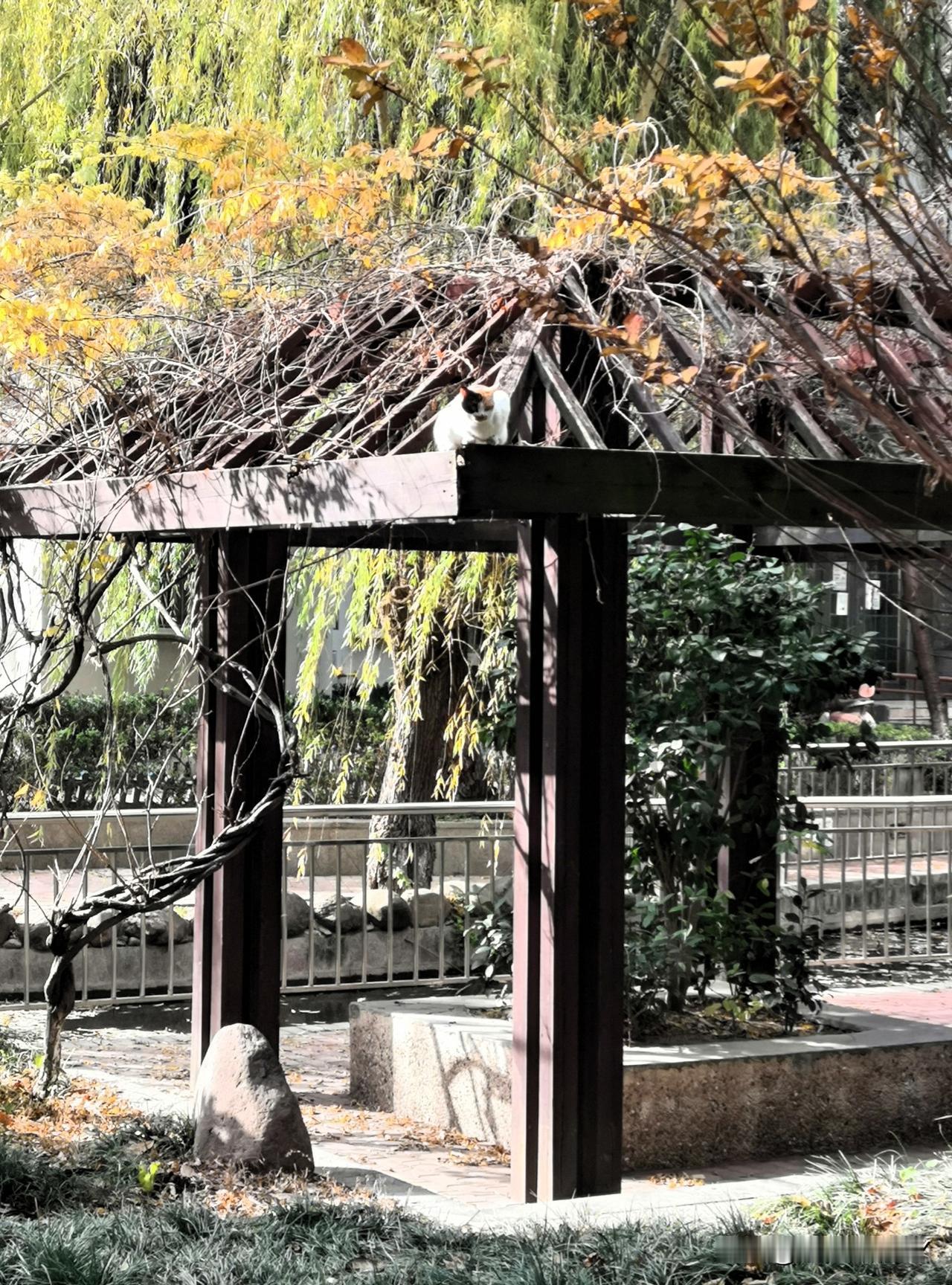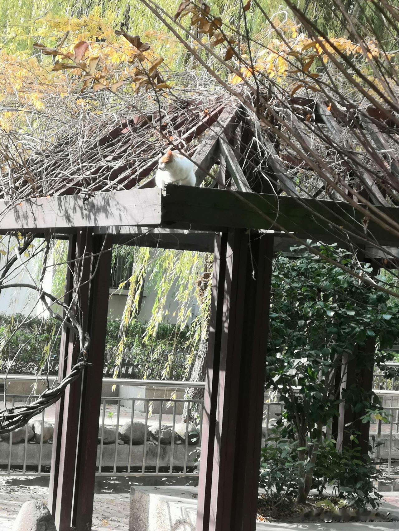 小区里撞见超有趣的一幕!一上一下两只母猫,上方是俏皮的三花猫,下面方是憨萌的橘猫