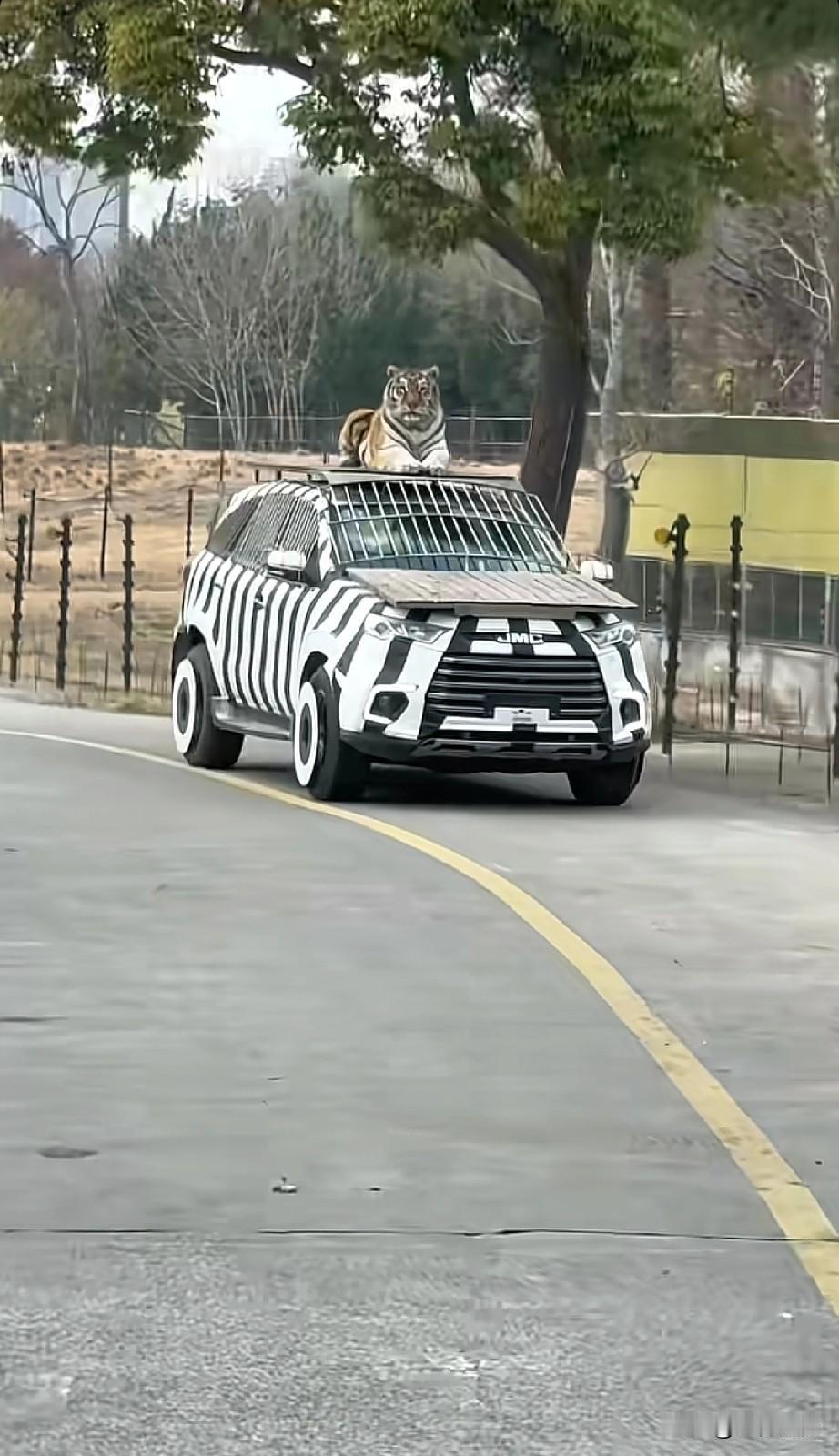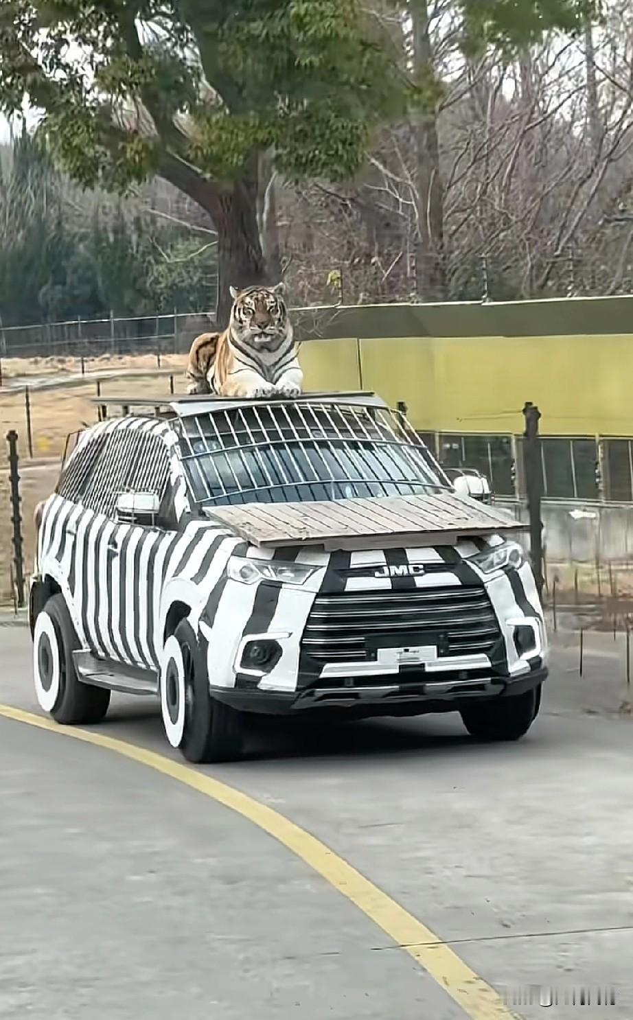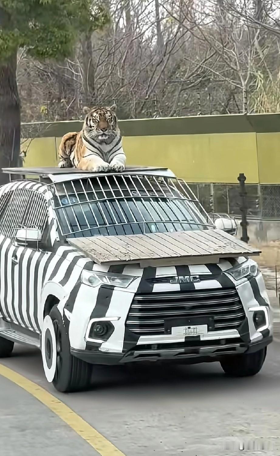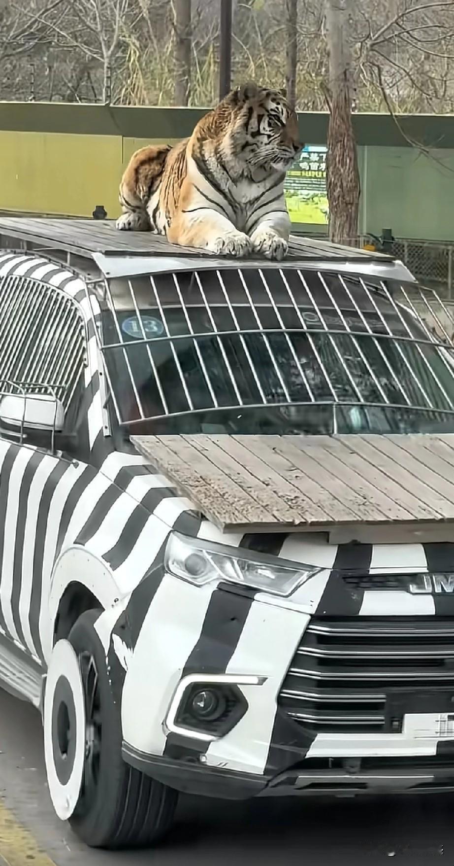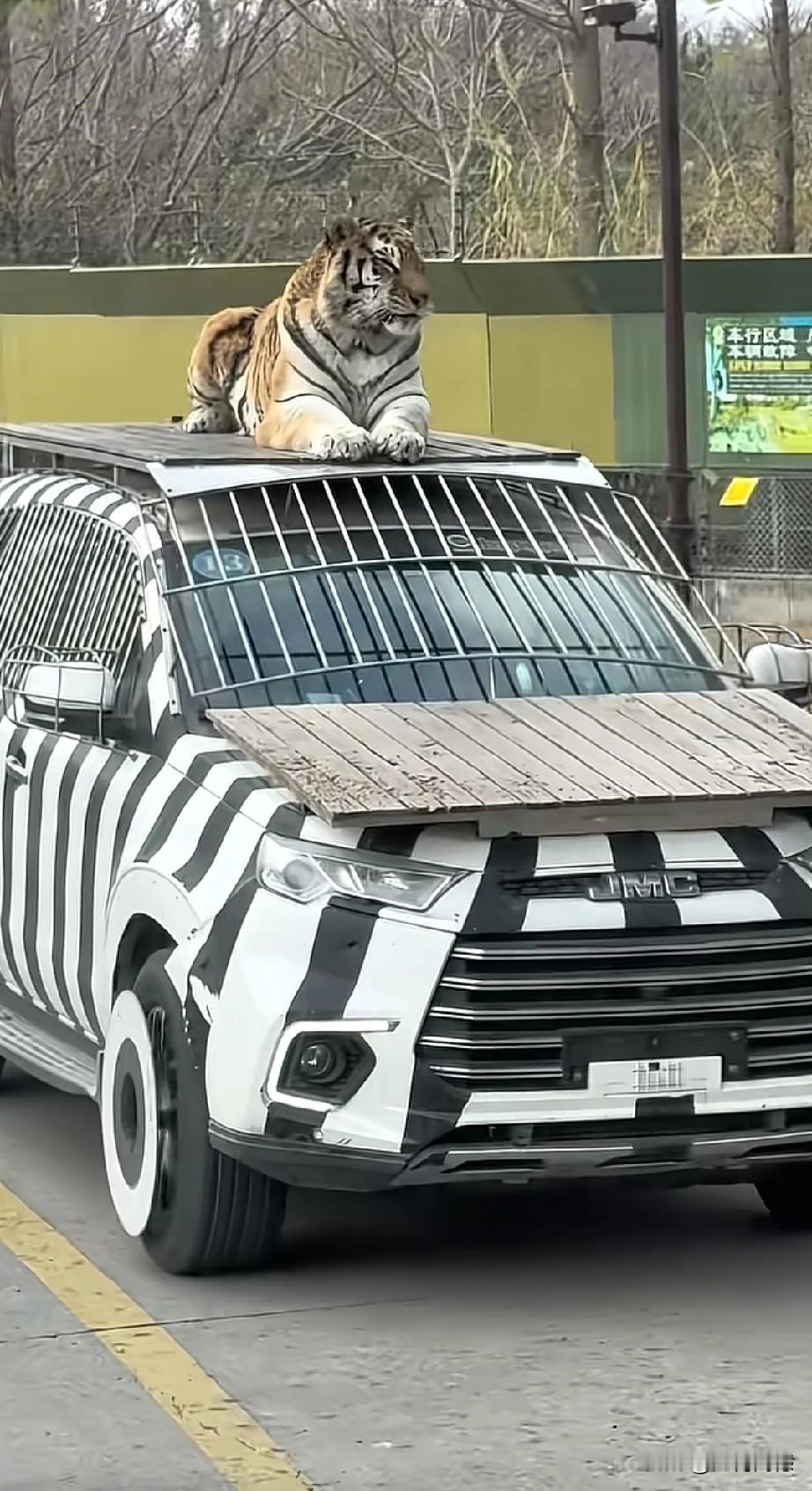 这只老虎坐在了车的上面,非常的安静,看这台车,保护设施还是比较全的,里面应该有游客,这大概是一个野生动物园,游人坐在动物园提供的车上,观赏这些野生动物,虽然车的保护设施很好,但是老虎趴在上面,感觉也是有点很可怕的!