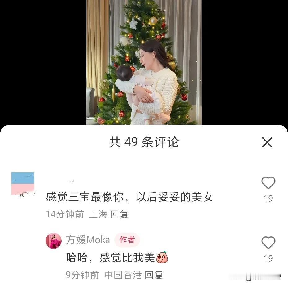 天王嫂方媛抱着三宝,在家里的圣诞树前合照。 看画面,三宝发量好多啊,头发乌黑浓密,头型也很漂亮。小小的她软软糯糯,在妈妈的怀里安心的睡着觉。 方媛不像产后妈妈,身材和脸蛋都恢复得特别好,状态非常年轻。 网友在评论区说道:感觉三宝最像你,以后妥妥的大型美女。 方媛就在评论区跟网友互动,骄傲的说道:哈哈,感觉比我美! 看吧,好自信啊! 毕竟爸爸帅气,妈妈原生脸高颜值,生下来的孩子颜值肯定差不了。