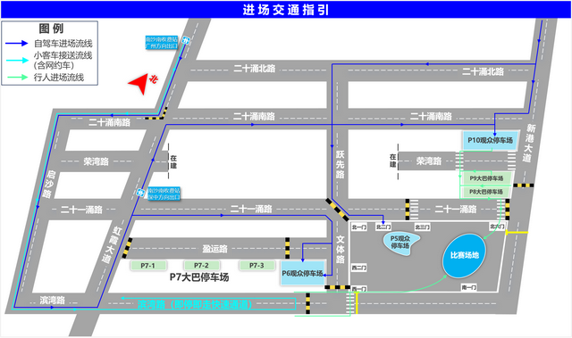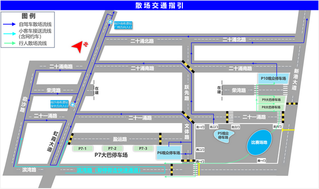车辆停放P10停车场的观众,建议经二十涌南路—跃先路—二十涌北路—新港大道驶离。
