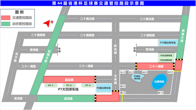 二十一涌路(北二门—北六门)、盈运路(虹霞大道—P6停车场出入口)、文体路(P6停车场出入口—滨湾路)、滨湾路(西一门以西100米路段)、新港大道(北往南掉头口—二十一涌路)将实施交通管控,禁止车辆通行。虹霞大道、新港大道、滨湾路等路段将实施动态交通管控。