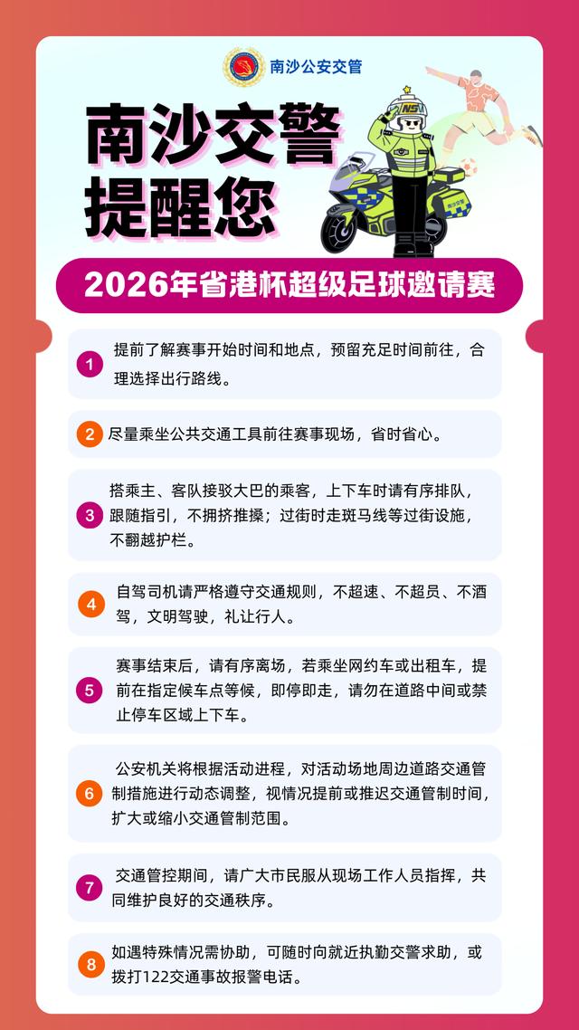 新快报讯第44届省港杯足球赛第二回合将于1月3日在大湾区文化体育中心举行。为确保本次比赛安全、顺利开展,公安机关将对比赛场地周边路段实行临时交通管控,适时管控时间为1月3日12:00至20:00。