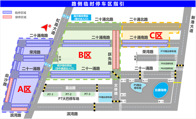建议由南沙南收费站下高速,经启沙路出虹霞大道后前往P5、P6停车场停放,或由新龙收费站下高速,经新港大道、二十涌南路前往P10停车场停放后,沿行人通道前往比赛场地。