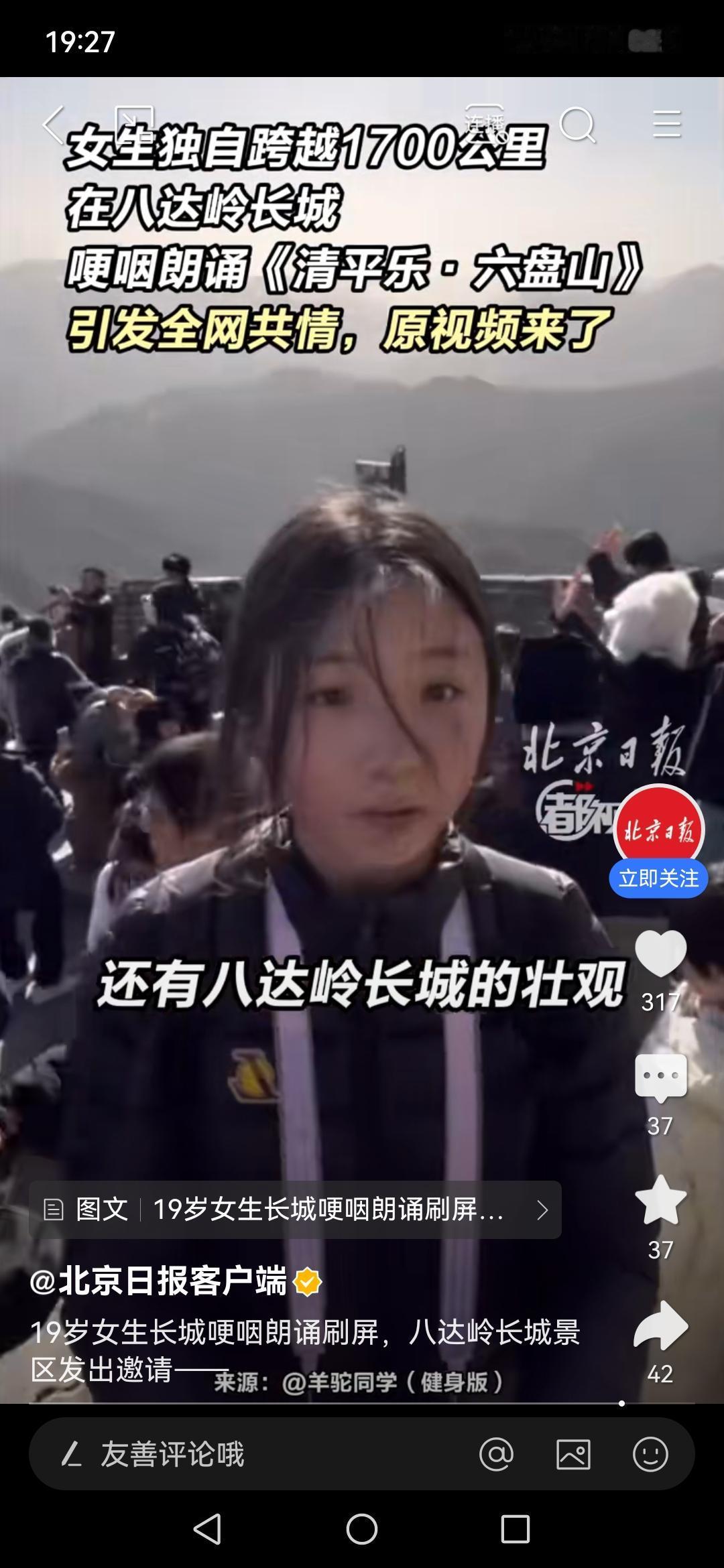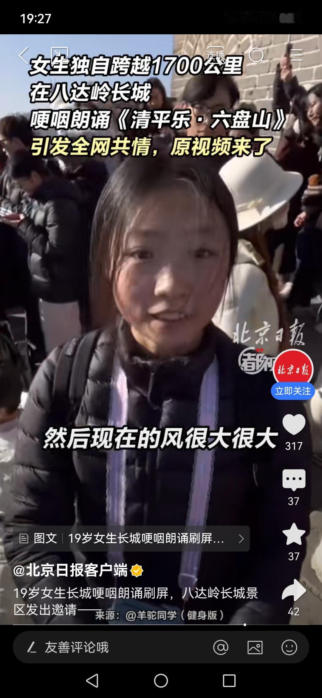 19岁女生长城哽咽朗诵刷屏,八达岭长城景区发出邀请——这一幕,藏着中国人刻在骨子里的滚烫热爱 19岁女生长城之上哽咽朗诵,字字泣血句句动情,视频一出瞬间刷屏全网,八达岭长城景区火速隔空发邀请,这波双向奔赴,看哭了无数网友,也让刻在中国人骨子里的家国情怀,狠狠破防! 谁能想到,一段即兴朗诵能有这么大的感染力!视频里,19岁姑娘身着素衣站在长城烽火台,迎着呼啸的寒风开口,起初声音清亮,念到山河壮阔、先辈热血时,情绪瞬间涌上心头,声音哽咽颤抖,眼眶泛红含泪,却依旧字字铿锵,把对山河的热爱、对岁月的敬畏,全融进了一字一句里。 风吹乱了她的发丝,却吹不散那份赤诚;泪水模糊了双眼,却清晰了心中的信仰。没有华丽的修饰,没有刻意的煽情,就是这份最纯粹、最真挚的情感,狠狠戳中了千万网友的心。有人评论“听着听着就哭了,这是刻在血脉里的共鸣”,也有人说“19岁的她,读懂了长城的厚重,也扛起了青春的热爱”。 要知道,长城从来不是冰冷的城墙,每一块青砖都藏着岁月的故事,每一道沟壑都印着先辈的足迹。多少人奔赴长城,为的就是触摸这份跨越千年的厚重,感受山河无恙的安稳。这位姑娘的哽咽,不是脆弱,是共情,是年轻一代对家国、对山河最热烈的回应,这份纯粹的热爱,无关年龄,不分地域,是刻在每个中国人骨子里的本能。 视频爆火后,八达岭长城景区第一时间发声,暖心发出专属邀请,诚邀姑娘再赴长城,还将为她送上专属礼遇,愿她再登长城之巅,续写心中热爱。景区的这份暖心回应,不仅是对姑娘的认可,更是对这份赤诚热爱的守护,网友直呼“这波双向奔赴太好哭了,景区格局拉满”! 如今的我们,生在红旗下,长在春风里,不必再经历山河破碎的苦难,却永远不能忘记,今日的国泰民安,是先辈用热血换来的。这位19岁姑娘的朗诵,正是年轻一代的心声:我们懂山河的厚重,更懂肩上的责任;我们心怀热爱,更愿奔赴山海。 你看哭了吗?你心中有没有那份对山河的滚烫热爱?如果登上长城,你最想朗诵一句什么话?八达岭长城 女孩动情地说 女孩动情地说