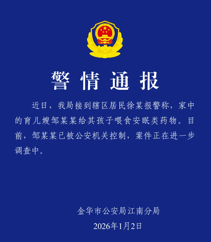 近日,我局接到辖区居民徐某报警称,家中的育儿嫂邹某某给其孩子喂食安眠类药物。目前,邹某某已被公安机关控制,案件正在进一步调查中。