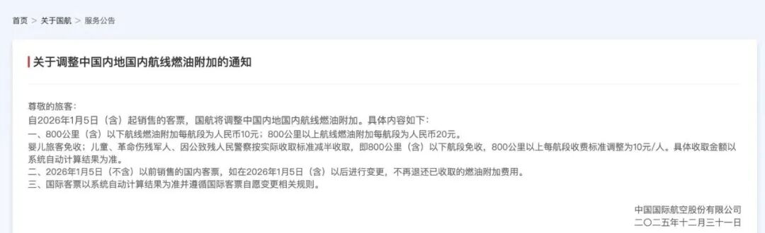 近日,东方航空、南方航空和中国国际航空发布通知,自2026年1月5日(含)起销售的客票,调整国内航线旅客运输燃油附加费征收标准。