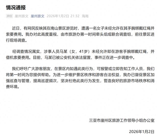 经调查情况属实,涉事人员马某(女,41岁)未经允许即在游客手腕绑戴红绳,并借机索要费用。目前,马某已被公安机关依法留置,事件正在进一步调查中。
