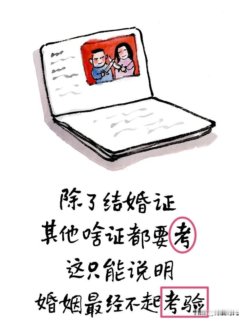 别的证都要考 结婚证却不用考 这事儿挺有意思 医生、律师等职业证 需严格考试 为保证从业者能力 保障社会运行 可结婚证为何不用考呢 婚姻是社会制度 旨在建立稳定家庭 促进社会和谐 它不像职业 不完全依赖知识技能 更看重双方情感、责任感和共同价值观 有人认为婚姻也需沟通、解决冲突等能力 缺乏这些或致婚姻破裂 但婚姻是个人选择 强制考试似不尊重选择权 它本质是自由意志体现 且生活本就是对婚姻的考验 很多“考试”藏在日常里