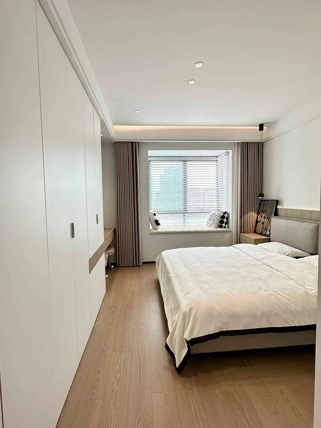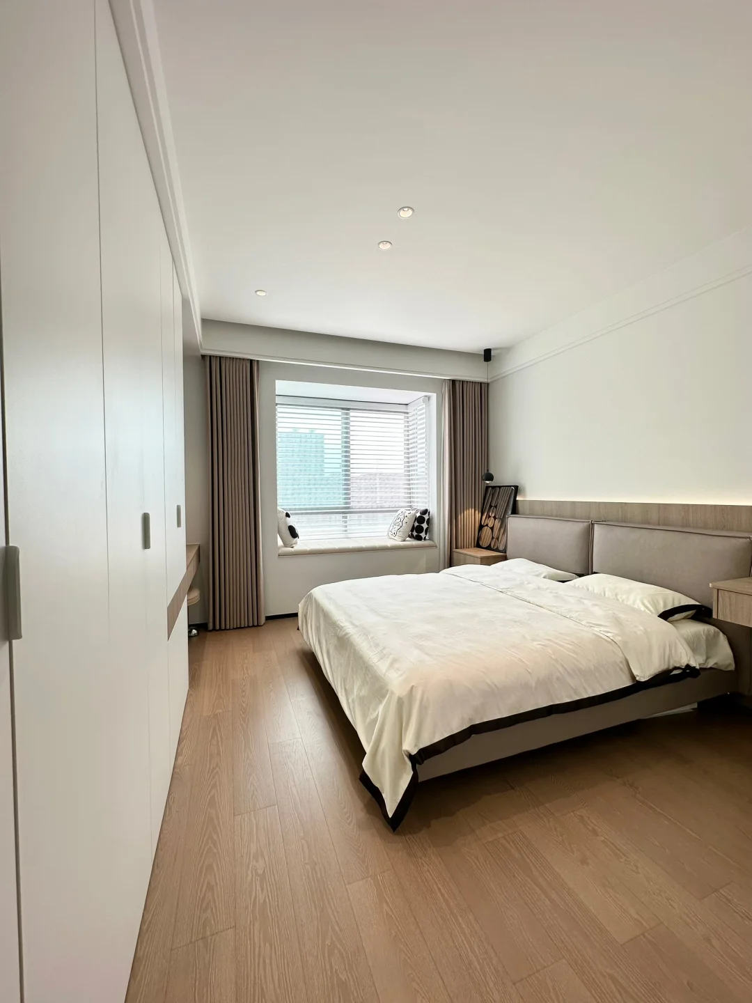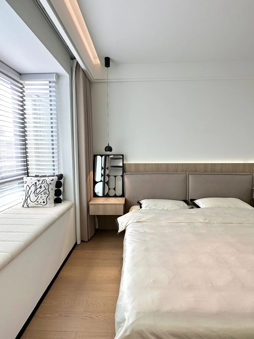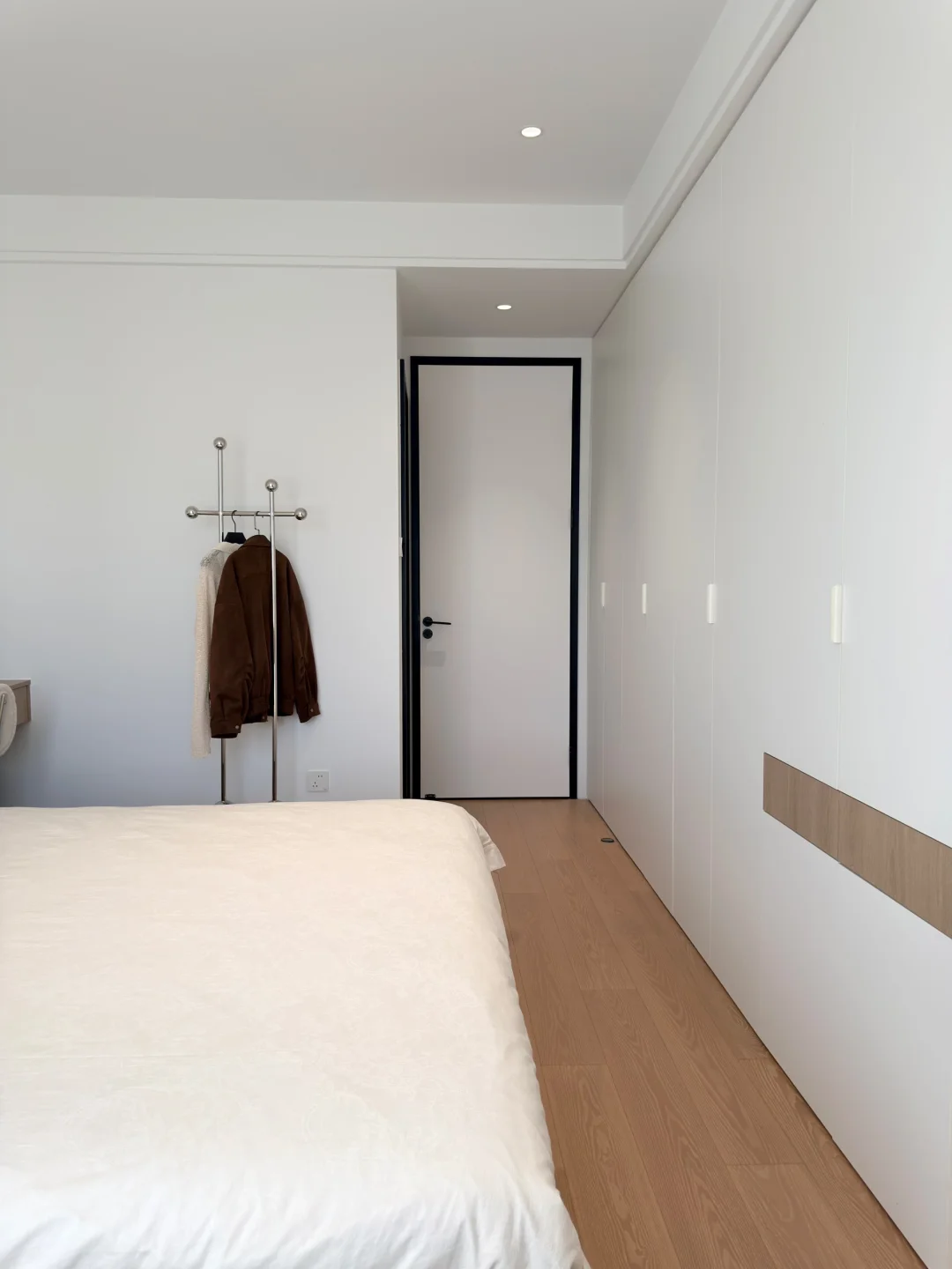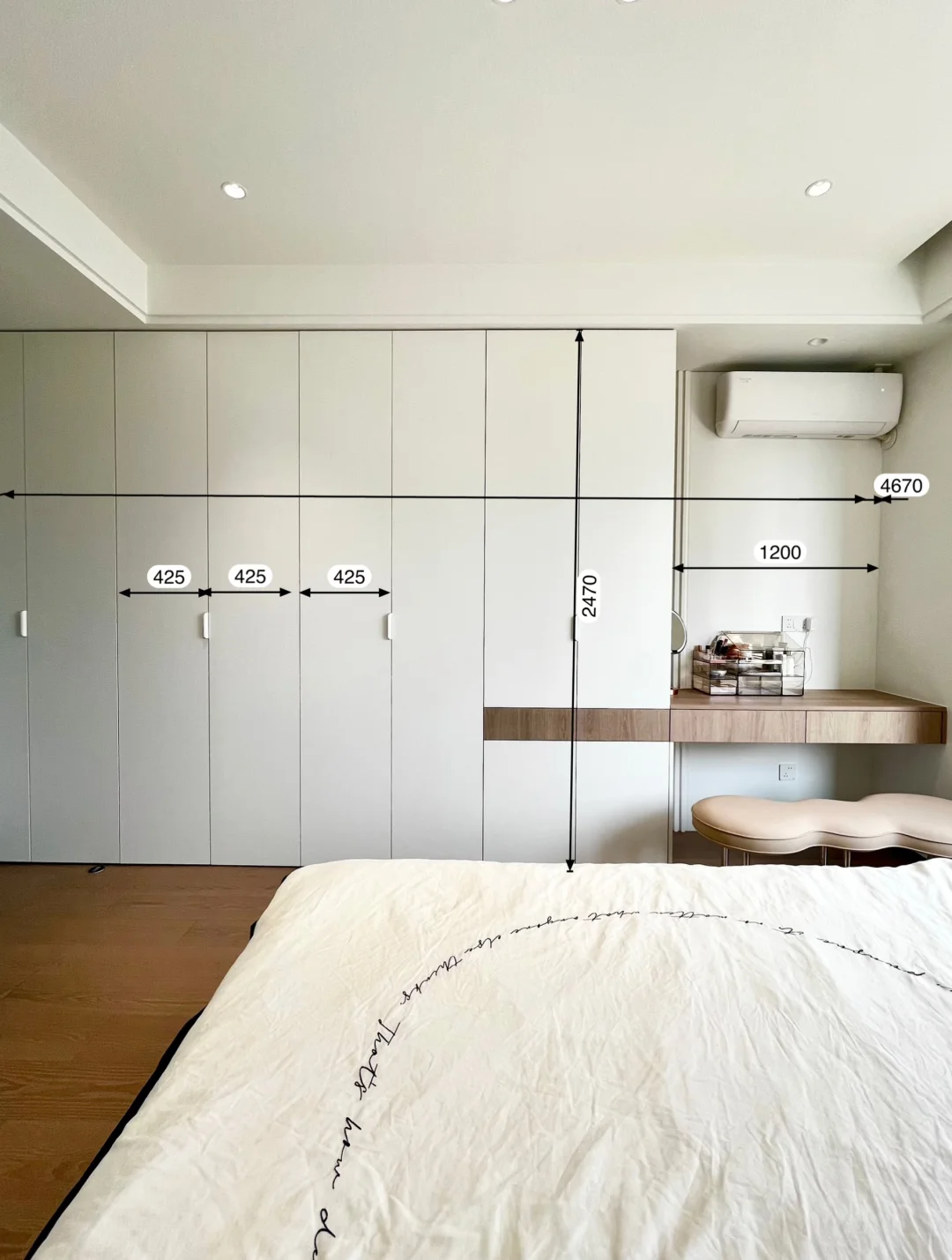 还好当初没听老公的做L型衣帽间,入住三年多,床尾衣柜真的是实用又显空间大,衣柜空间也增加了一倍,卧室放了一张1.8*2m的床,做了床尾衣柜之后床尾过道还有90cm,很宽敞,真的太爽啦![派对R] 各种详细尺寸供参考!衣柜尺寸在图5️⃣!👇 主卧开间3.7米,宽4.7米 护墙板高度:115cm 厚度1.8cm 护墙板离墙 5cm 床头高度:100cm 床头柜长度:52cm 宽度:45cm 高:18.5cm 离地:42cm 板材:W1000+h1377
