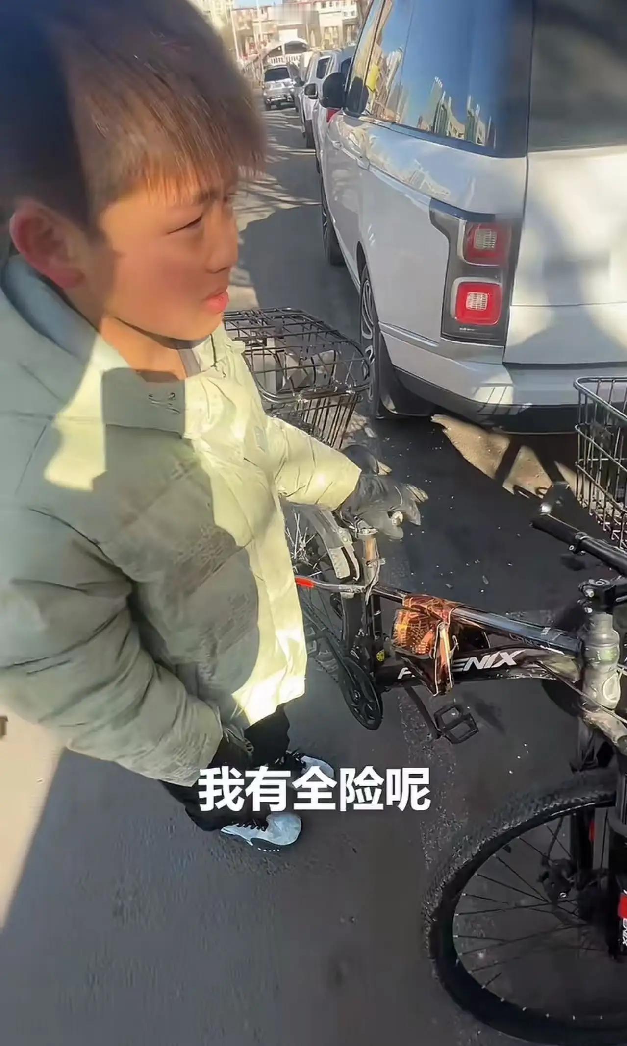 “活该你开大路虎!”内蒙古呼和浩特,小男孩骑自行车不小心撞了停在路边的大路虎,但