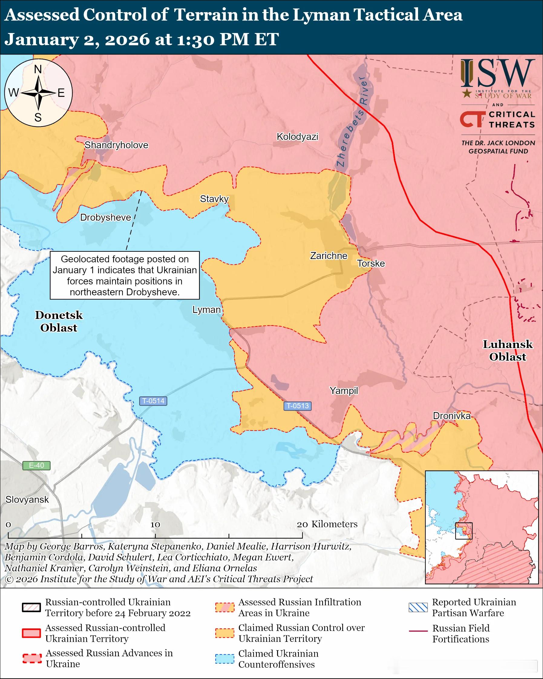 俄军主要行动2俄军目标:占领卢甘斯克州剩余部分,向西推进至哈尔科夫州东部,并包围顿涅茨克州北部。1月1日和2日俄军继续在库皮扬斯克方向发动进攻,但没有取得进展。俄军于12月31日和1月1日至2日在库皮扬斯克附近、库特基夫卡以北、彼得罗·伊万尼夫卡以北、克拉斯涅·佩尔舍和菲霍利夫卡以东、新瓦西利夫卡以东、彼得罗巴甫利夫卡以东以及库里利夫卡和赫卢什基夫卡以东发动进攻。俄方声称,乌克兰军队在库皮扬斯克以及布拉霍达季夫卡和涅奇沃洛季夫卡(均位于库皮扬斯克以西)附近进行了反击。乌克兰军事观察员马绍韦茨于1月1日报告称,由于损失惨重,俄第68摩步师第6营和第121和第122摩步团无法解救被围困在库皮扬斯克方向的俄军突击队残余。乌克兰军事观察员尤里·布图索夫于12月31日报告称,乌克兰军队正在逐屋清剿库皮扬斯克,但俄罗斯无人机阻碍了乌克兰军队的行动。12月31日一位俄罗斯军事博主声称,乌克兰军队利用大雪天气削弱俄罗斯无人机的性能,向库皮扬斯克运送增援部队。12月31日另一位俄罗斯军事博主声称,乌克兰军队已经完全包围了库皮扬斯克的俄军,并切断了俄军向前方突击部队的后勤补给。作战序列:据报道俄第27独立摩步旅(第1近卫坦克集团军[GTA],MMD)正在库皮扬斯克附近作战。第352摩步团(第11军[AC],LMD)和第47坦克师(第1近卫坦克集团军)正在库皮扬斯克方向作战。12 月 31 日和 1 月 1 日至 2 日,俄军在博罗瓦东北部的诺沃普拉托尼夫卡和博胡斯拉夫卡附近、博罗瓦东部的希基夫卡附近以及博罗瓦东南部的诺沃沃迪亚内和诺沃耶霍里夫卡附近发动了进攻。乌克兰军队最近在斯拉维扬斯克-莱曼方向保持阵地并取得进展。俄罗斯声称占领的区域范围:1 月 1 日发布的地理定位视频显示,俄第 252 摩托化步兵团(第 3 摩步师,第 20集团军,MMD)的黑曼巴突击队炮击了位于德罗比舍韦东北部(莱曼西北部)的乌克兰军队,而俄方声称俄军在该地区保持着存在。12 月 31 日和 1 月 1 日至 2 日,俄军在莱曼西北部的新谢利夫卡和德罗比舍韦附近、莱曼北部的斯塔夫基附近、莱曼东北部的科洛迪亚齐和米尔内附近以及莱曼东部的扎里奇内附近发动了进攻。1月1日在莱曼方向作战的乌军旅发言人报告说,俄军在莱曼方向遭受了重大损失,并且人员短缺。战斗序列:据报道顿巴斯地区的迪卡亚师(俄罗斯志愿军)正在用“冰雹”多管火箭炮袭击斯拉维扬斯克附近的乌克兰军队。12 月 31 日夜间至 1 月 1 日,乌克兰军队继续对被占领的卢甘斯克州的俄罗斯军事目标进行中程打击。乌克兰无人系统部队 (USF) 指挥官罗伯特·“马扎尔”·布罗夫迪少校于 1 月 1 日报告称,乌克兰军队袭击了被占领的罗文基(距前线约 120 公里)的一个燃料和润滑油储存库。