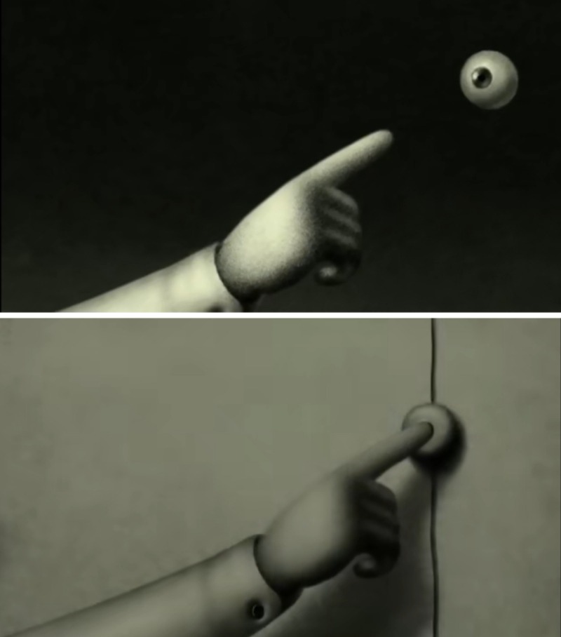 孤独修道,心生杂念。没放下就是没放下,没放下也没什么丢人的。书生惶恐又向往,怯懦又勇敢,不去听不去看,只是让双耳化作巨大的蝶翅,《耳中人》的耳道变《鹅鹅鹅》的鹅笼,那里,倒是去得去不得?恰如杜丽娘府上迷情花园,倒是去得去不得?踟躇的书生常常要拿出一面镜子,仿佛要从耳孔探寻脑中,那光给出一个表现主义的投影:心魔。