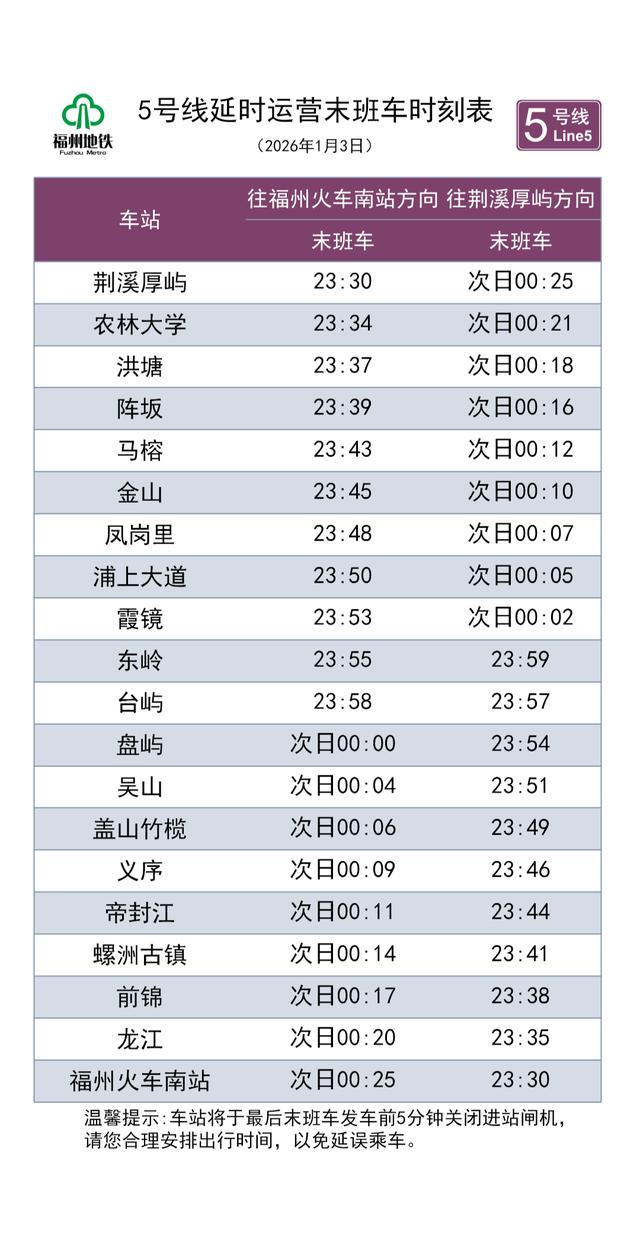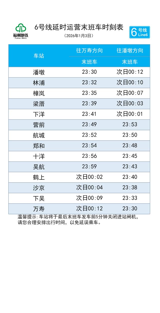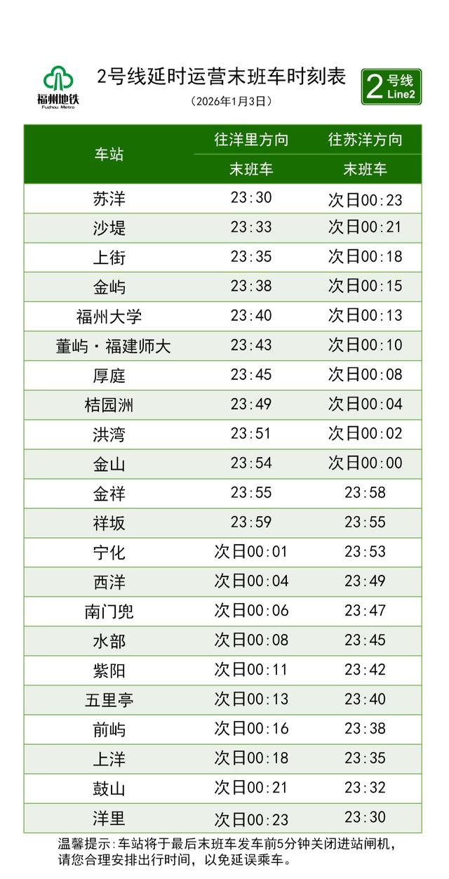 1月3日当天,福州地铁1号线、2号线、4号线、5号线、6号线以及滨海快线,运营末班车统一延至23:30始发。延时运营期间各线路行车间隔为15分钟。