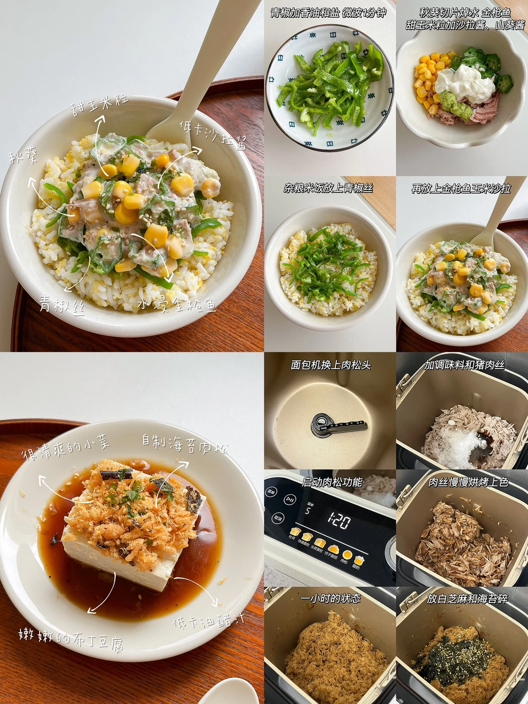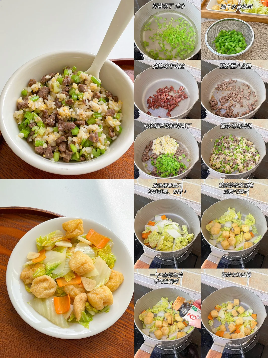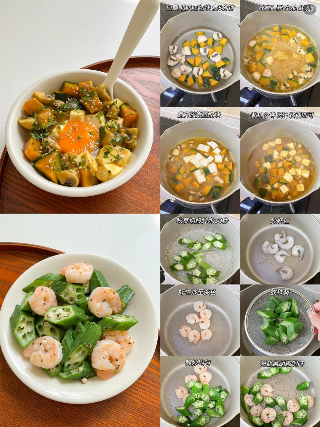 “每天花一点时间搭配一下三餐的饮食其实很简单。健康饮食也是想拥有更轻盈的体态和保持更好的身体状态!每天摄入足够的营养,按时吃一日三餐,丰富多样的食物就很满足了。” 🎉今天分享四份低卡减脂午餐 都是简单营养的 ❶咖喱南瓜豆腐饭+秋葵虾仁+红枣姜茶 ❷芹菜牛肉炒饭+白菜炒豆腐泡+柳橙汁 ❸牛排西兰花玉米炒饭+杏鲍菇炒包菜+酸梅汤 ❹青椒玉米金枪鱼饭+肉松布丁豆腐+热牛奶 我的饮食思路很简单 就是优质肉类+蔬菜+杂粮饭 不知道吃什么就把喜欢的食材一起做成炒饭 油和盐控制好量 可以适当吃点原味坚果 🌰