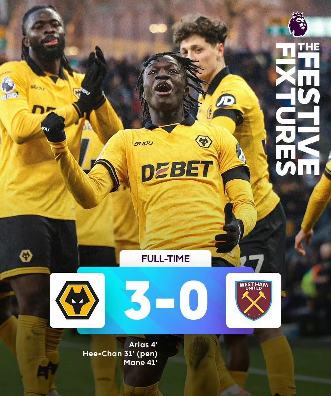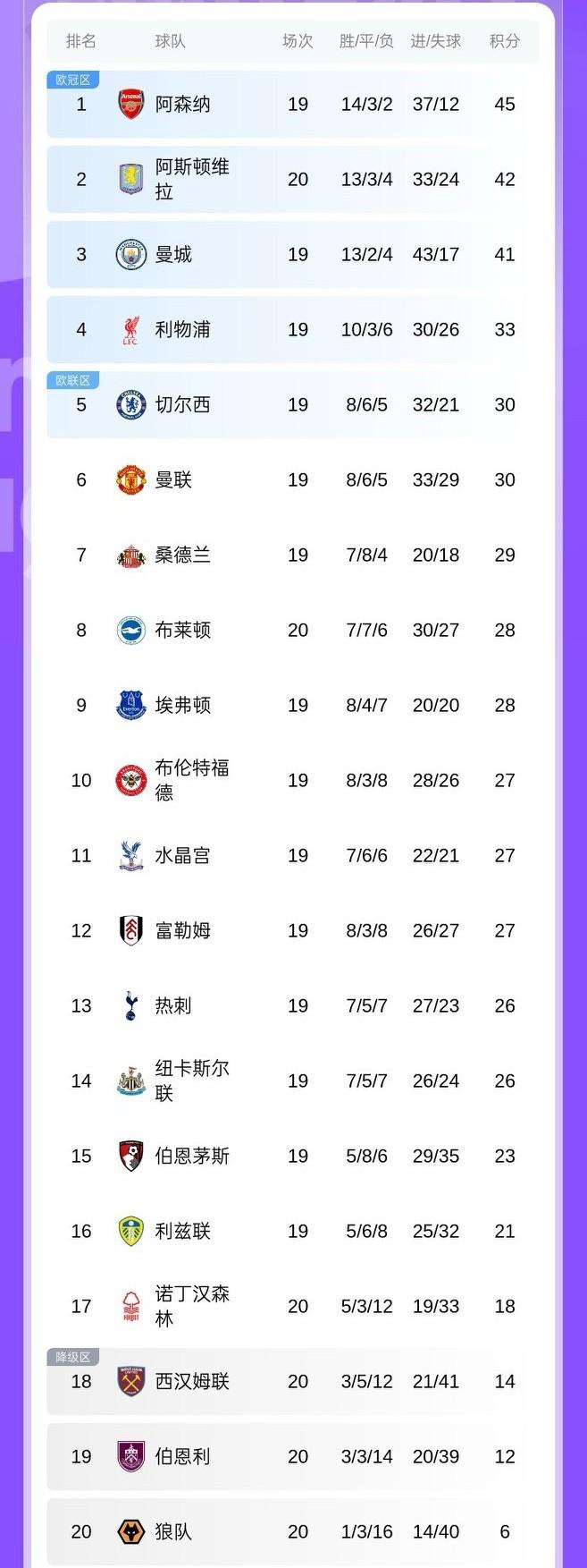 英超积分榜后四名先赛完第20轮,狼队终于开胡!经历漫长的20场比赛,3-0击败西汉姆联,上次赢球还是2025年4月。 森林队、西汉姆联、伯恩利都输球了,狼队距离第17的森林队12分,保级鸭梨山大。 维拉3-1击败森林队,排名升至英超第二,积分差距缩小到3分。