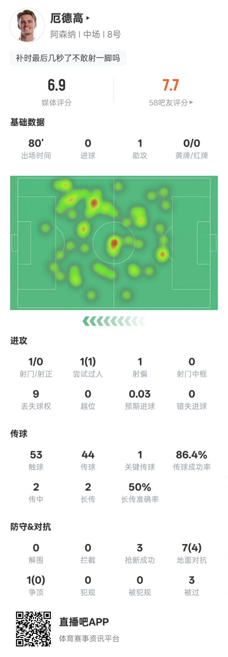 直播吧1月4日讯英超第20轮,阿森纳客战伯恩茅斯。厄德高首发出战,送出1次助攻,1次关键传球,还有3次抢断,评分6.9。