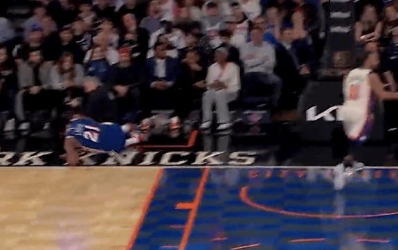恩比德上篮后踩到摄影师崴脚,好在并无大碍继续比赛