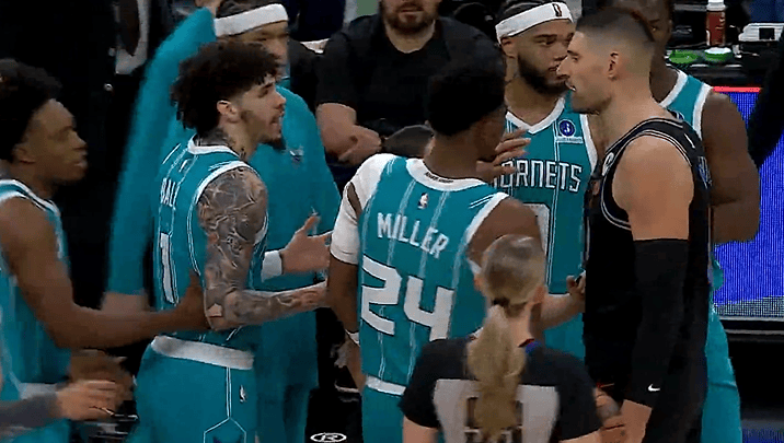 黄蜂最后时刻大比分领先,拉梅洛-鲍尔1打0扣篮险造冲突