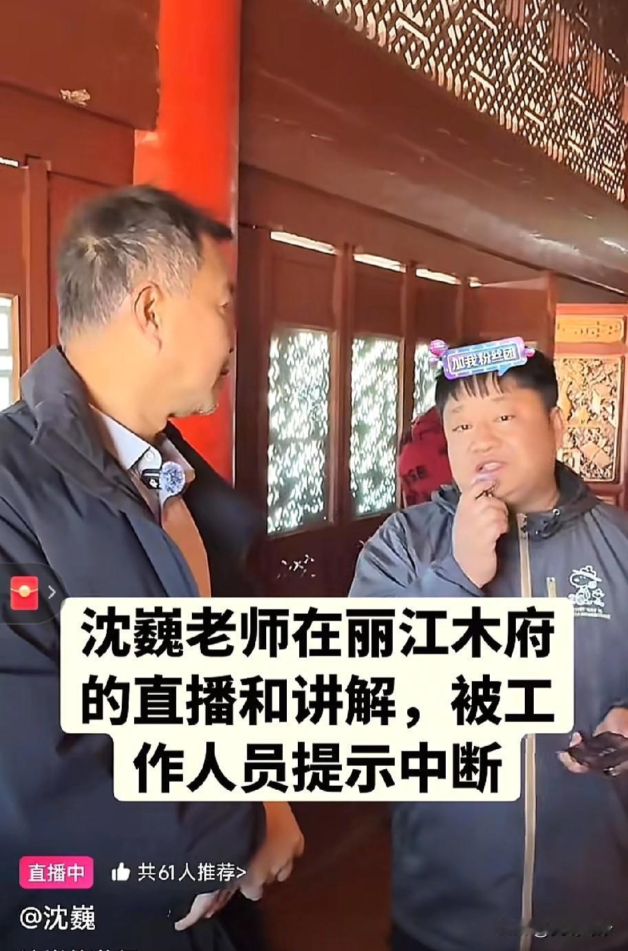 流浪大师沈巍丽江又被禁播! 就在今天,就在刚刚,沈巍一伙前往丽江沐王府直播,这次沈巍大师已经清理掉了缠在他身边的一众低层次没文化穷嗖嗖的他瞧不起的小主播,忠心耿耿,死心塌地的婷二前天也被沈大师打发回上海,沈巍大师终于可以用自己的账号直播赚钱了。 沈大师的信徒粉丝们依旧十分慷慨,礼物依旧很多,眼看着这一次大师又要大赚一票,不料沐王府工作人员突然出现,很不礼貌的直接说不允许直播,沈巍大师和石榴哥两位大网红尴尬的笑笑,只好停播,信徒粉丝纷纷发言为大师鸣不平,大呼传播文化,何错之有?他们到底怕什么? 不知道您怎么看?沈大师该被禁播吗? 上海沈巍