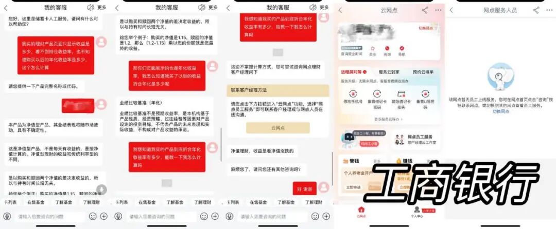客服作为信息披露和展示的补充解答渠道,也有部分银行无法给出解决方案。如工商银行人工客服给出的解答有些答非所问,追问之下建议记者联系网点理财客户经理咨询,并直接弹出对应线上链接。但根据客服给出的路径,工作时间记者附近网点显示“该网点暂无员工上线服务”,疑问最终未获解答。