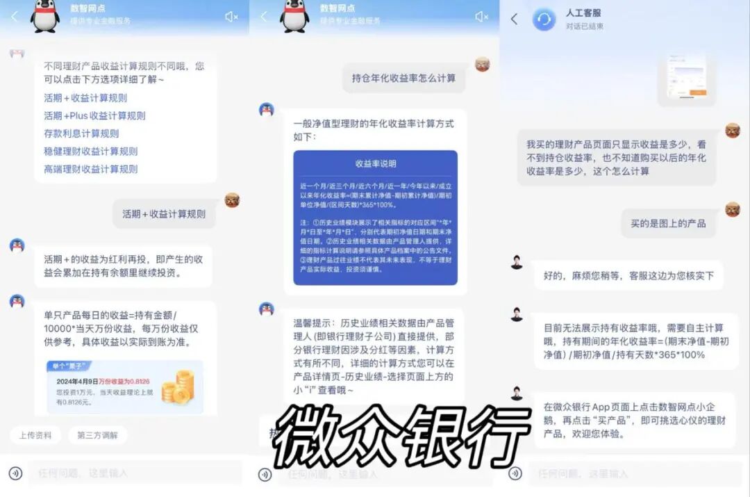 再如微众银行,智能客服能提供的部分产品的收益计算规则、一般净值型理财的年化收益率计算方式。咨询人工客服,其表示虽无法展示持有收益率但用户可以自主计算,并给出计算方式:持有期间的年化收益率=(期末净值-期初净值)/期初净值/持有天数*365*100%。若用户能够查询到自己所购买产品在某一个时间区间内期初和期末的单位净值,可通过上述公式进行计算。