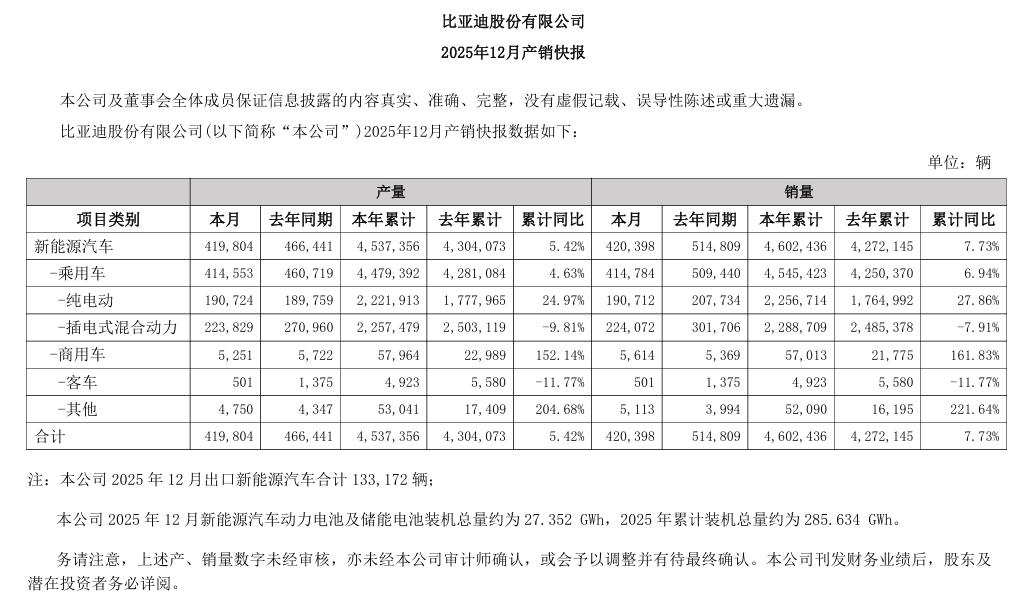 1月4日,比亚迪(002594.SZ)发布2025年12月产销快报。数据显示,2025年12月,公司新能源汽车产量41.98万辆,去年同期46.64万辆;销量42.04万辆,去年同期51.48万辆。2025年累计产量453.74万辆,累计同比增长5.42%,累计销量460.24万辆,累计同比增长7.73%。12月出口新能源汽车13.32万辆;12月新能源汽车动力电池及储能电池装机总量约27.352GWh,2025年累计装机总量约285.634GWh。