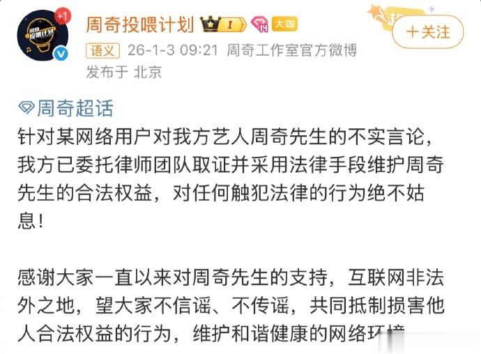 周奇工作室于当日9点21发布声明,定性司晓迪言论为“不实言论”,严重侵害艺人合法权益;已委托律师团队完成取证,将采取法律手段追责,强调“对任何触犯法律的行为绝不姑息”;呼吁公众“不信谣、不传谣”,抵制损害他人权益的行为,维护健康网络环境。