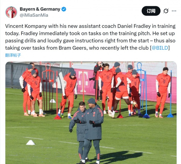 直播吧1月4日讯据《图片报》报道,拜仁新任助理教练丹尼尔·弗拉德利今日协助孔帕尼,参与球队训练。