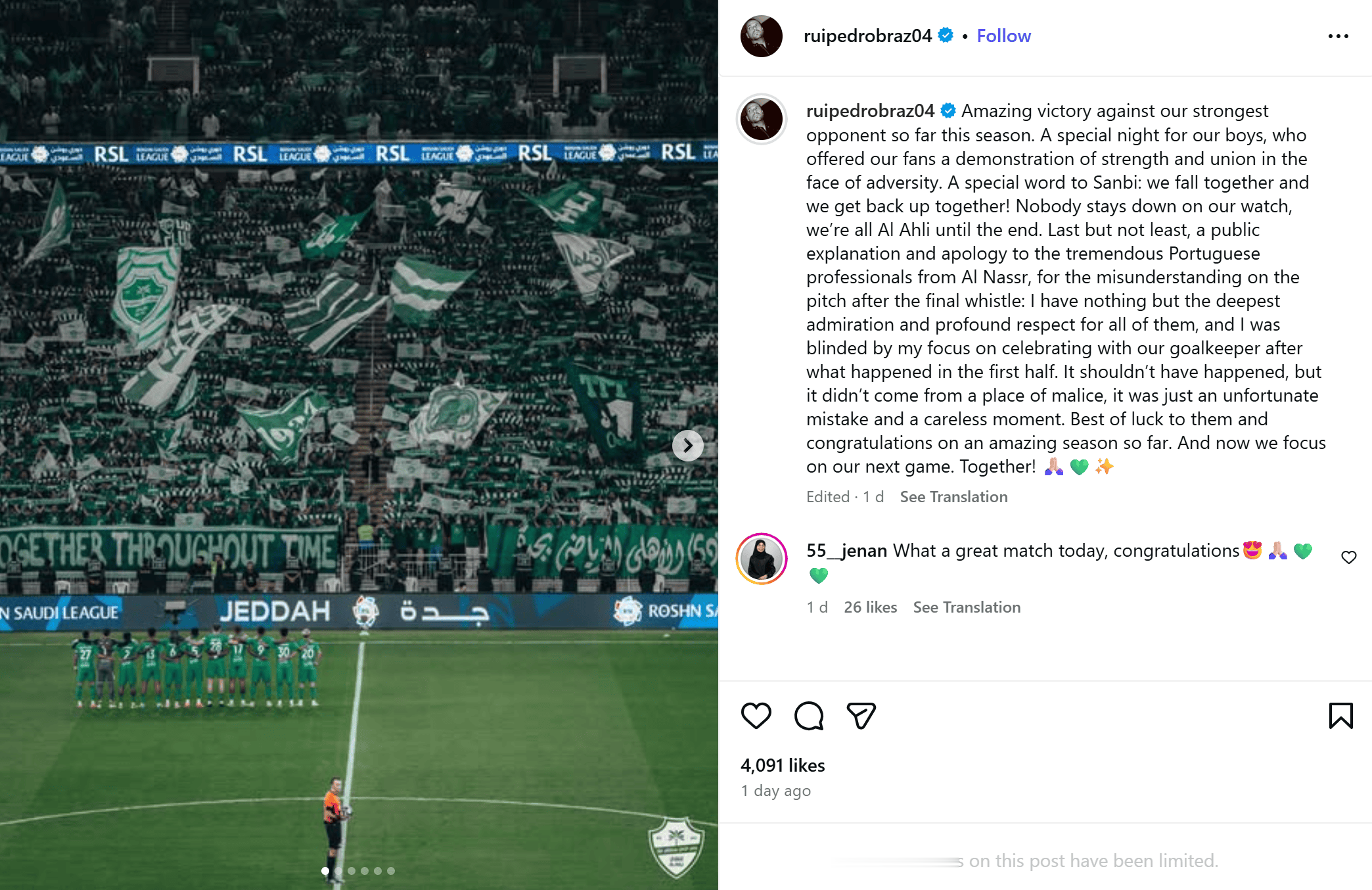 随后,他在声明中对利雅得胜利阵中的葡萄牙球员公开致歉,解释称终场哨响后发生在场上的误会,并再次重申自己对他们“只有最深的钦佩与尊重”。他表示,当时情绪高涨,注意力完全放在与本队门将一同庆祝,尤其是在上半场发生那件事之后,因此未能充分顾及场上的整体氛围,从而造成了误会。