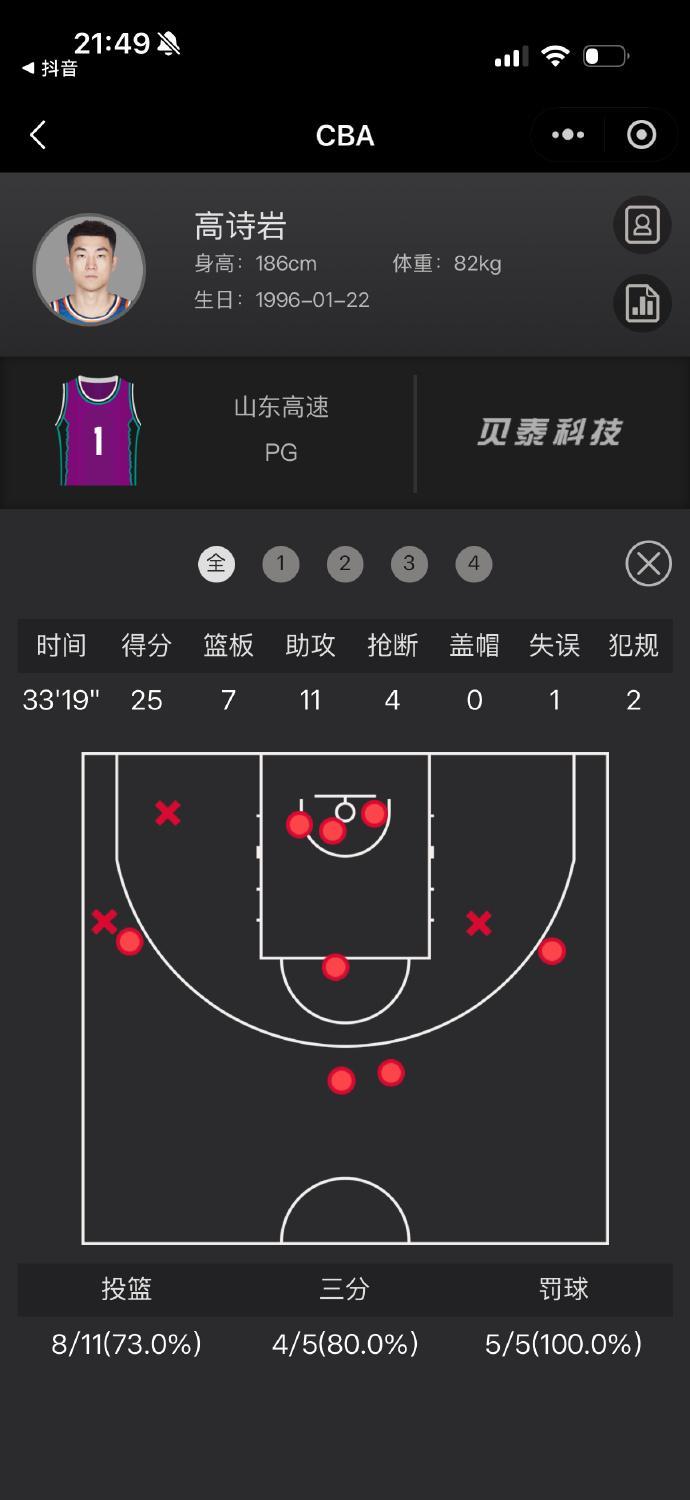 本场比赛,高诗岩三分5中4,砍下25分11助攻7篮板4抢断。