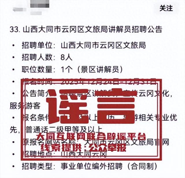 近期,网上发现“山西大同市云冈区文旅局讲解员招聘公告”的消息。经核实,该信息为不实内容,望广大网民不听、不信、不传。