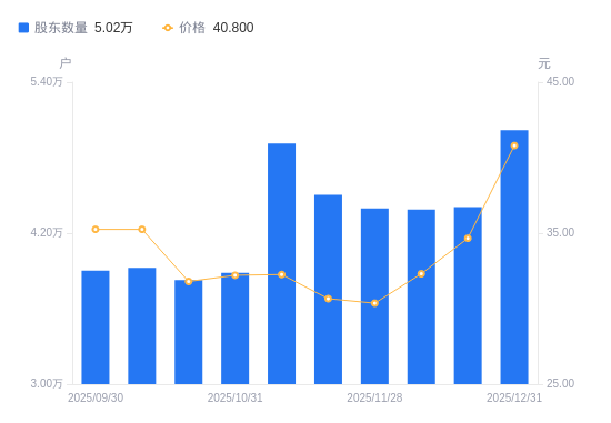 日期A股户数(户)流通A股户均持股数(股)户均持股市值(万元)2025-12-31501918440.0634.442025-12-19440749611.4533.312025-12-10438759655.0531.202025-11-28439649635.5029.252025-11-20450419405.1028.842025-11-10491348621.6327.812025-10-313884010906.6835.132025-10-203827011069.1235.202025-10-103923910795.7738.062025-09-303901710857.2038.27