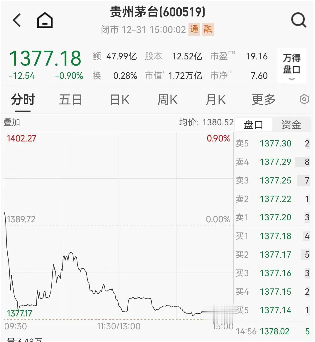 资本市场上,贵州茅台的股价已连续4个交易日下跌;在2025年12月18日至31日的10个交易日中,有8个交易日均收跌。据wind,截至2025年12月31日收盘,贵州茅台报1377.18元/股,跌幅为0.90%;2025年累计跌6.29%。