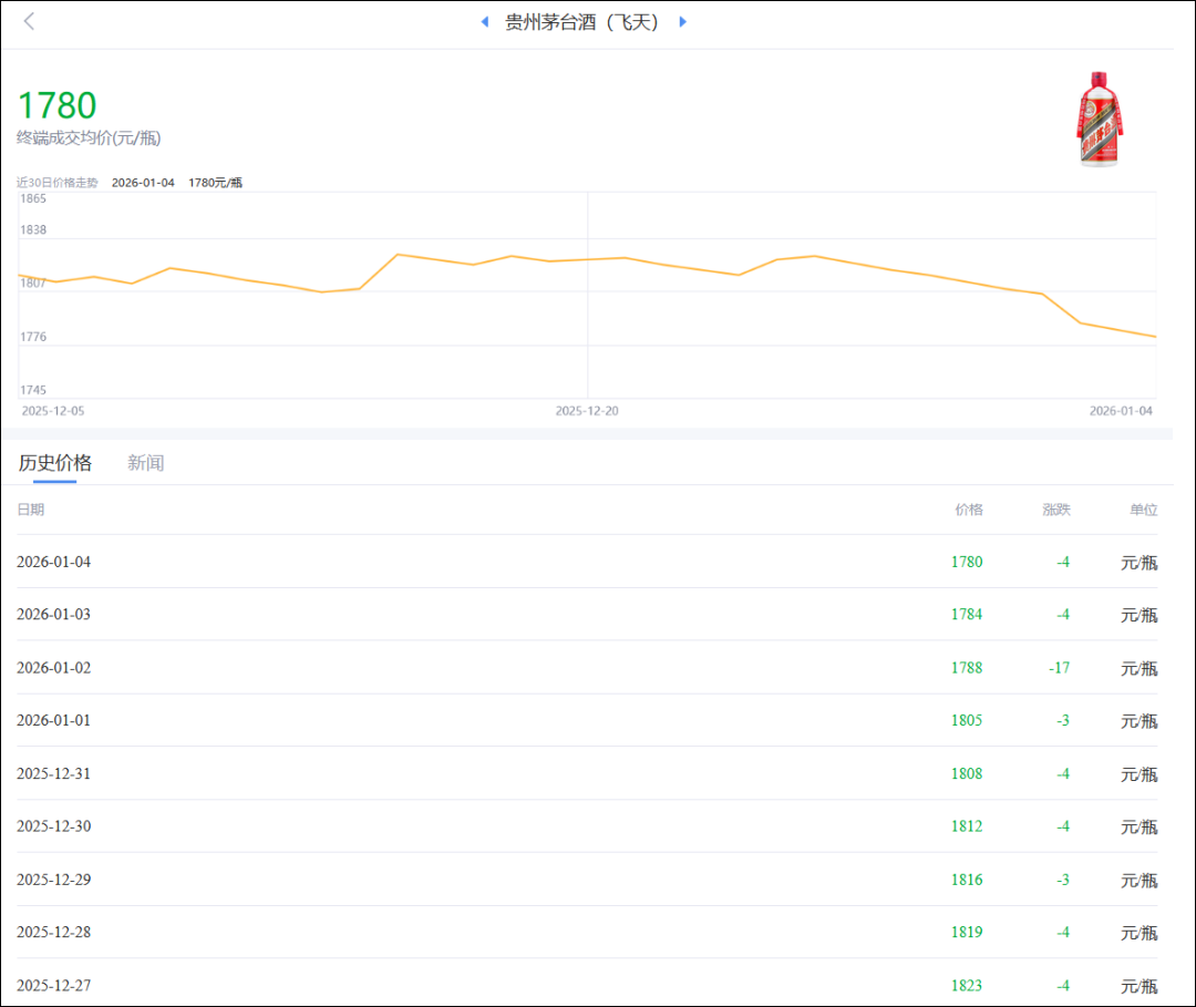 而在社会终端渠道上,电商平台上再次出现低于1499元指导价的售价。第三方平台“酒价内参”数据显示,飞天茅台过去24小时终端零售均价为1780元/瓶,回落了4元,已连跌9天,累计达23.59%;而2026年以来的4天,跌幅达到了15.49%。