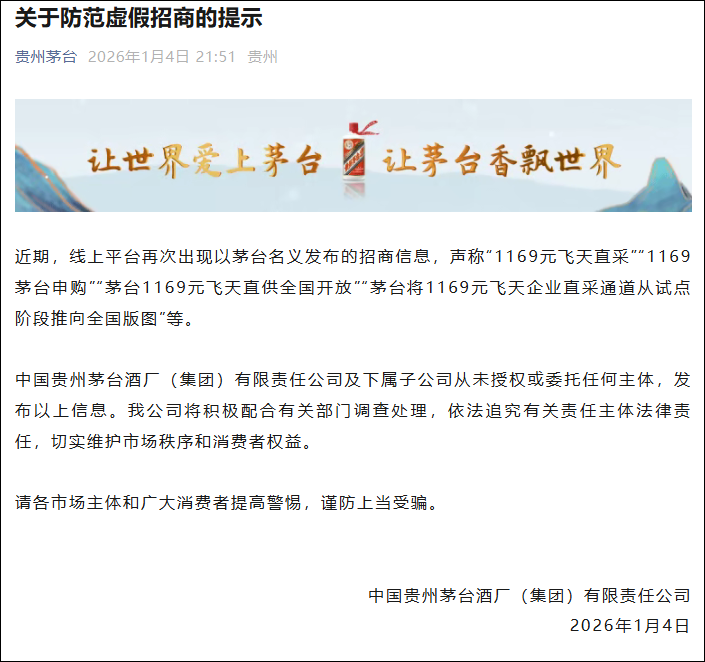 1月4日,中国贵州茅台酒厂(集团)有限责任公司发布《关于防范虚假招商的提示》。